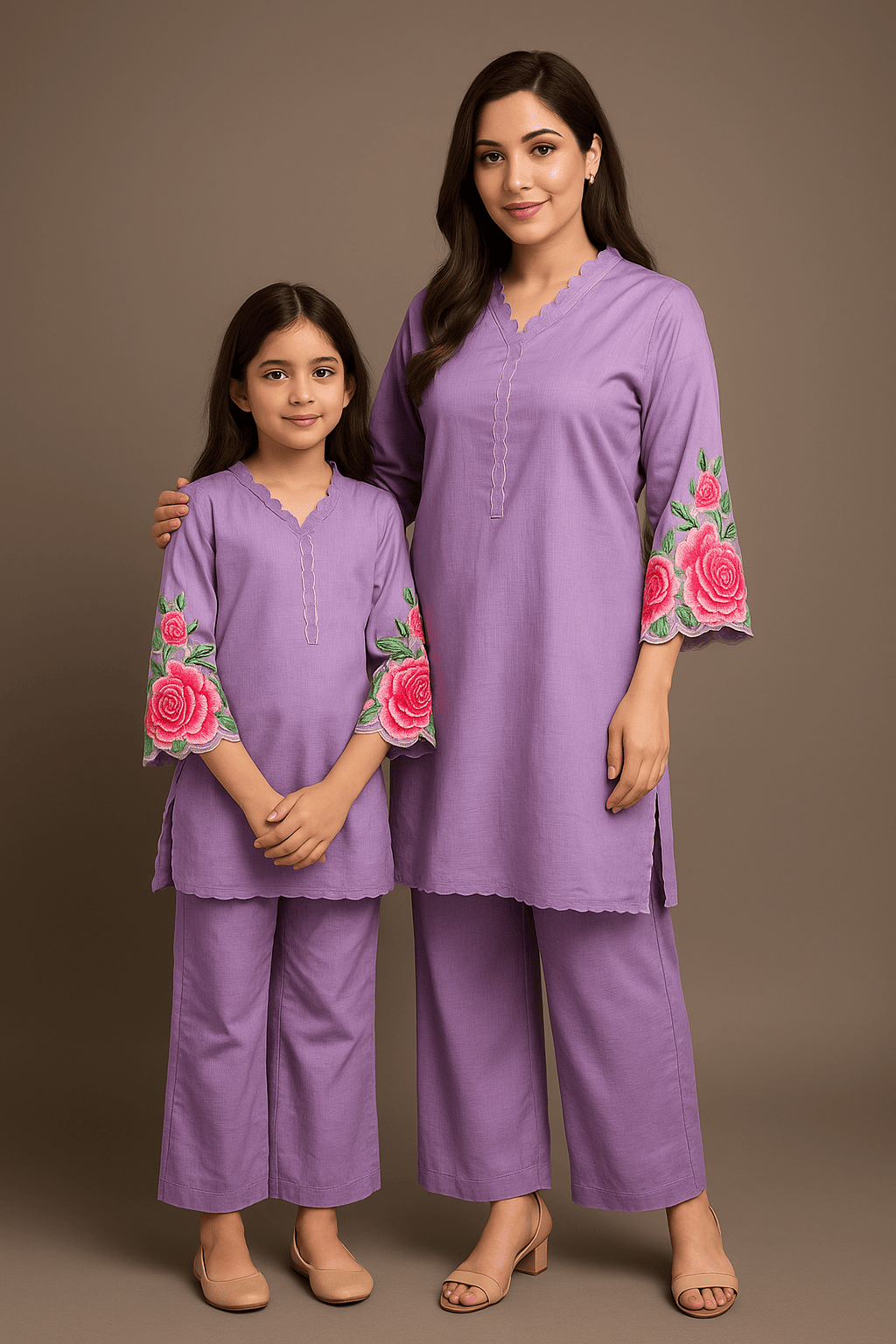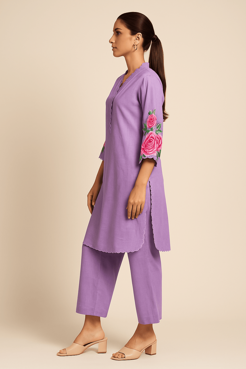 WOMEN'S BEAUTIFUL EMBROIDERED COTTON SLUB CO-ORD SET WITH PLAZZO PANT ATTATCHED ADDA WORK & LACE .