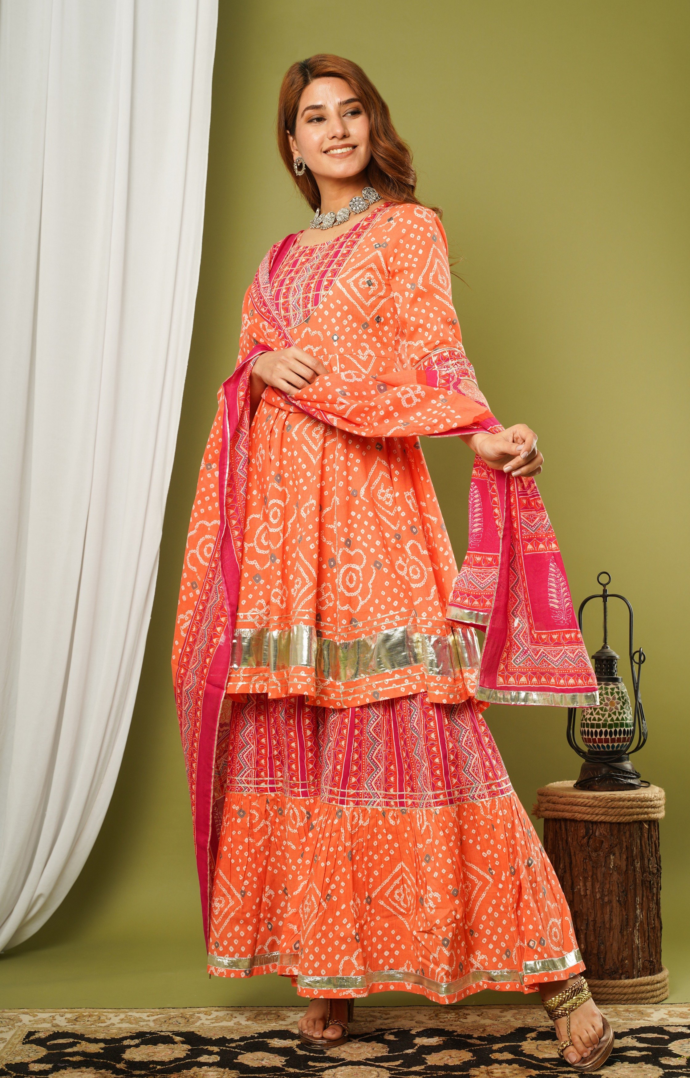 BANDHEJ FLAYERD KURTA WITH SHARARA WITH DUPATTA , GOTA WORK DETAILS