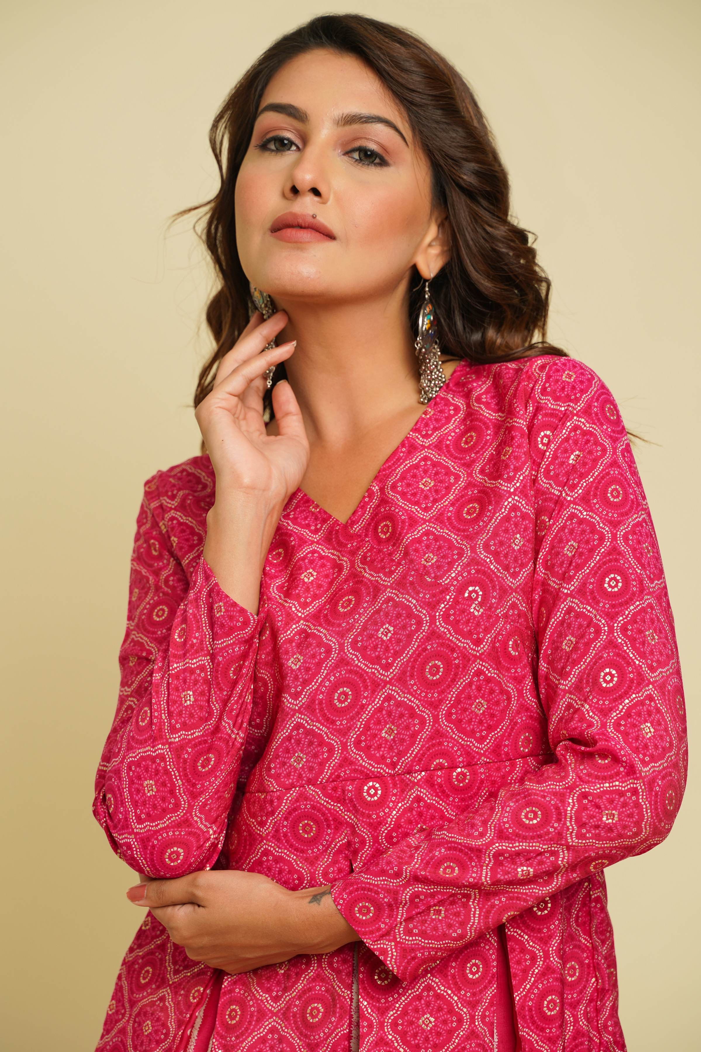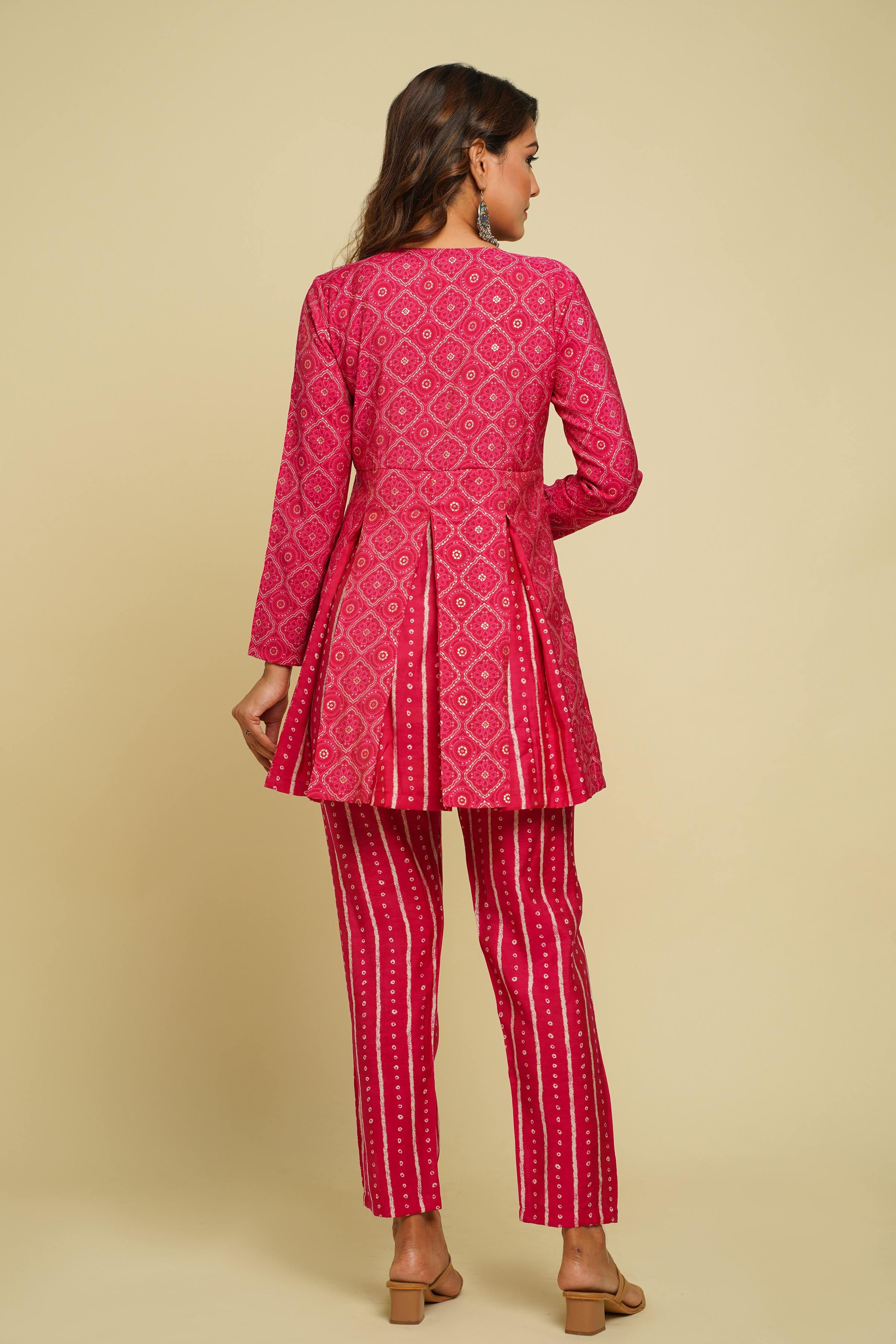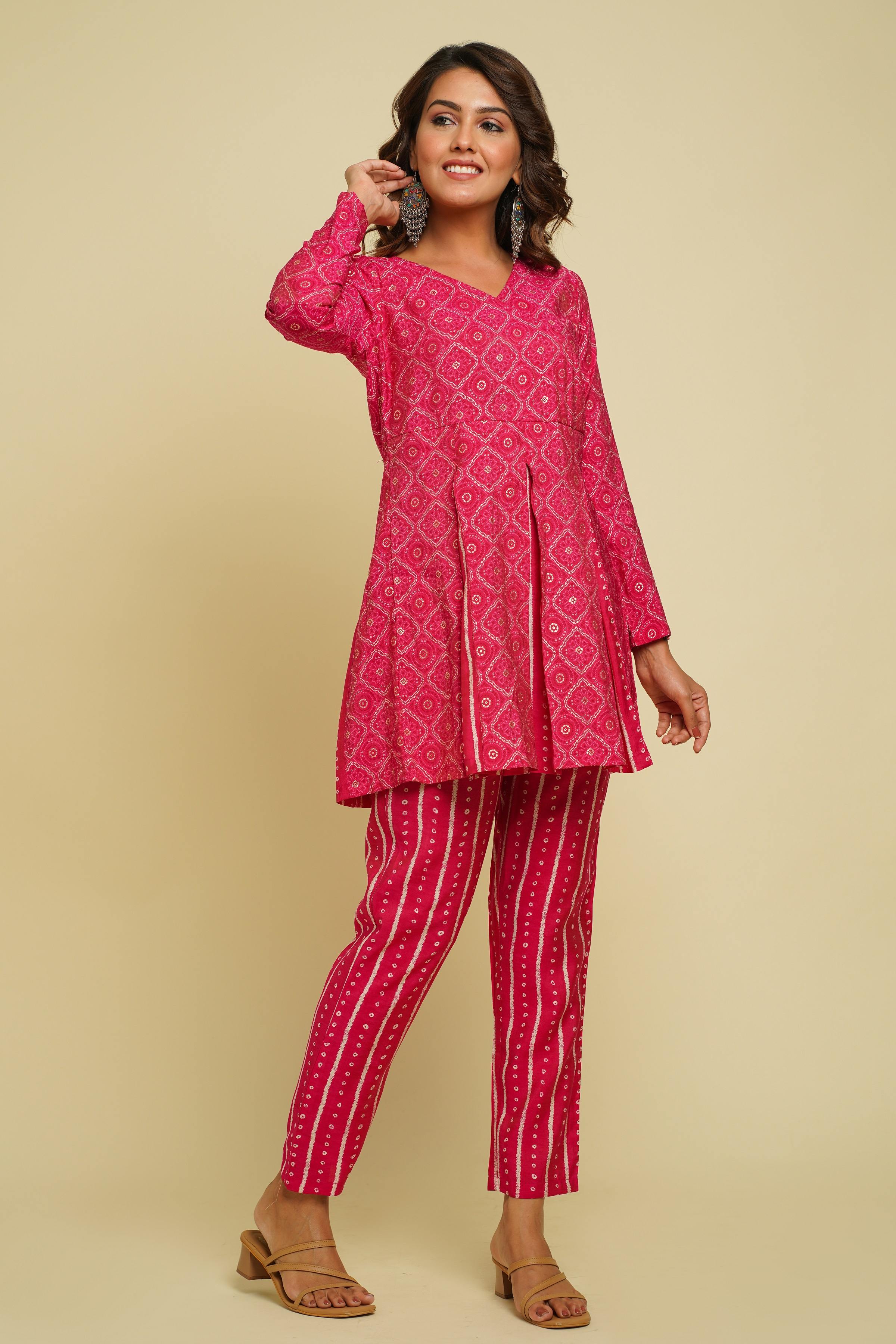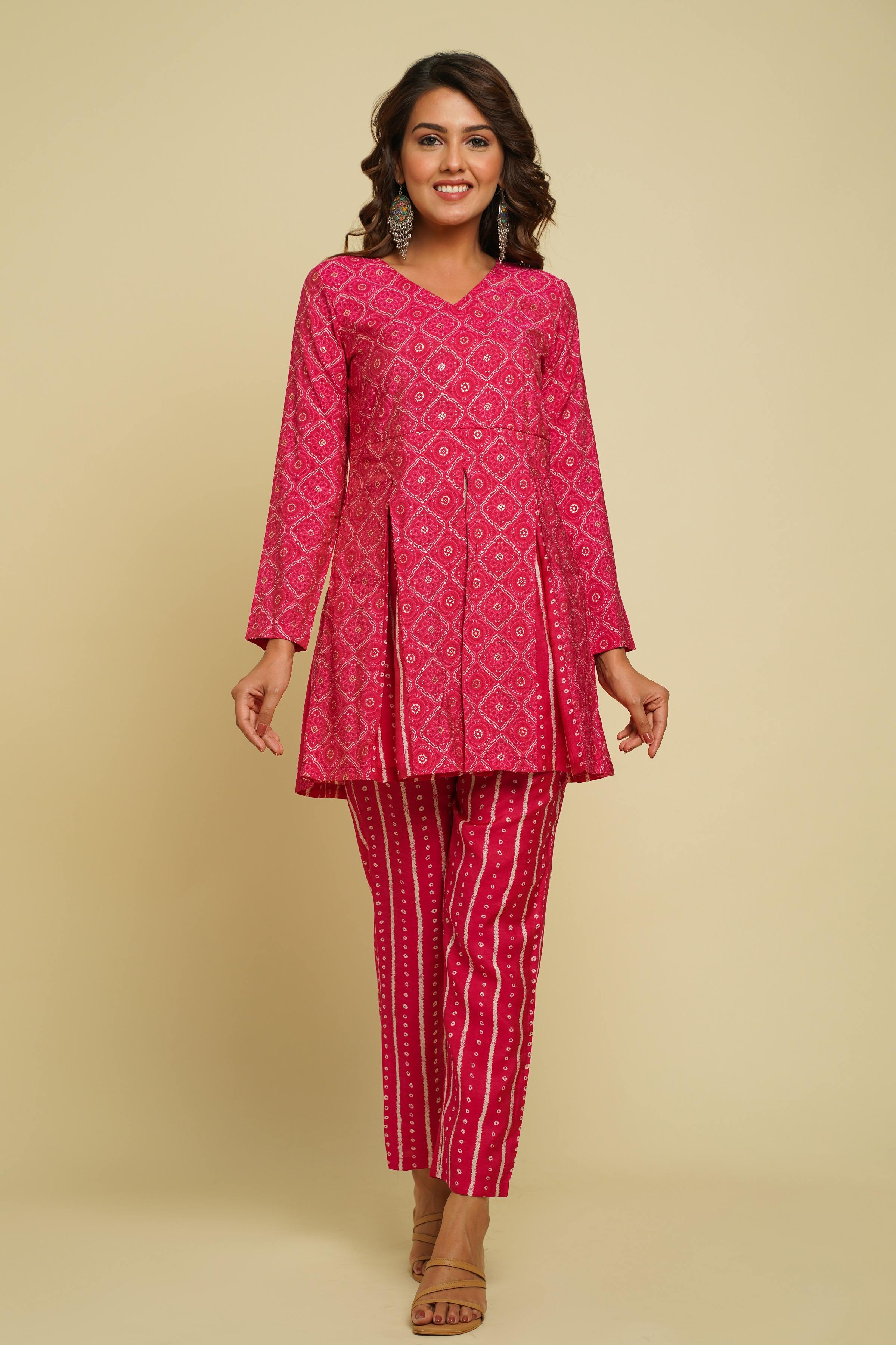 BEAUTIFUL FUSCHIA PRINTED V-NECK DESIGN CO-ORD SET