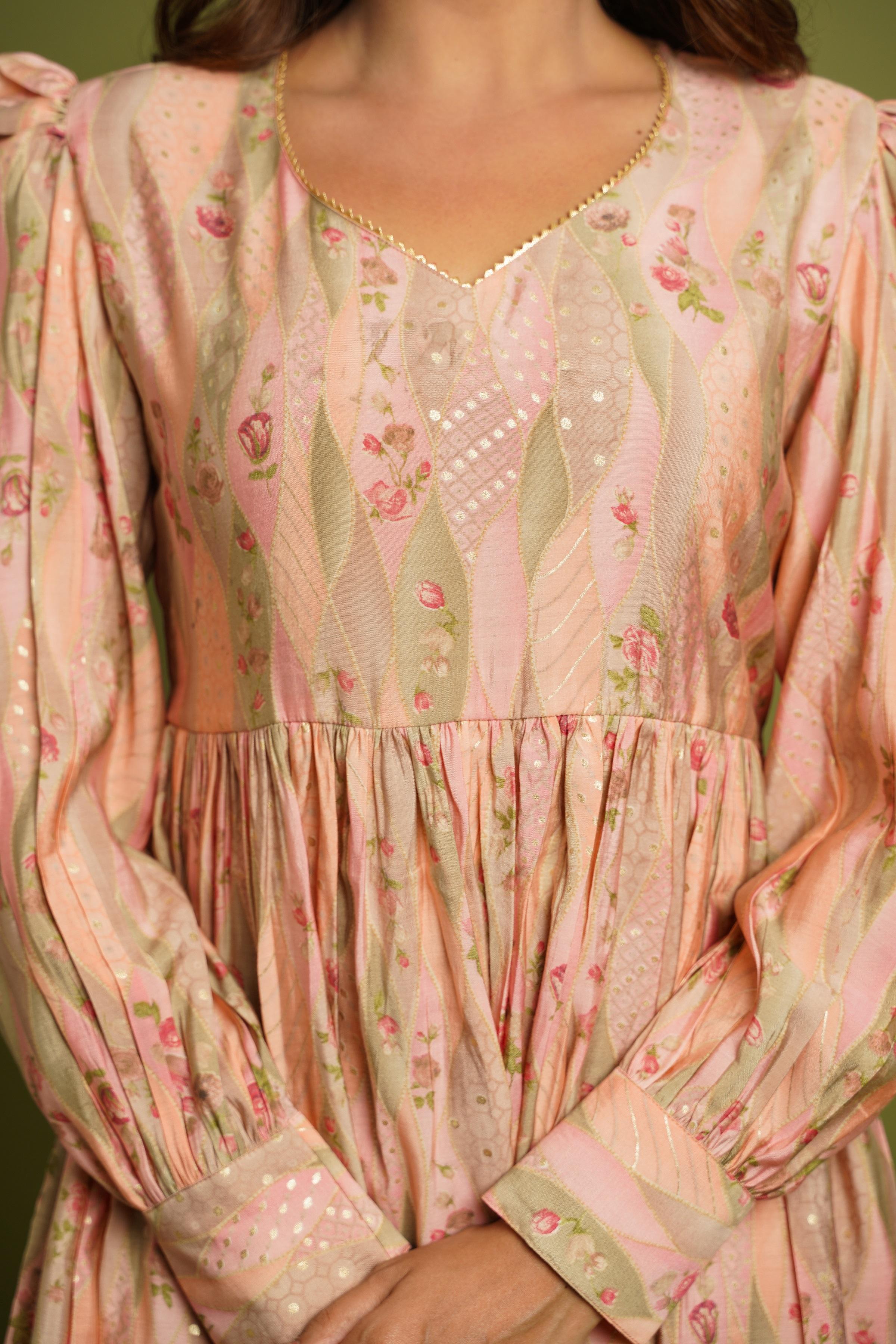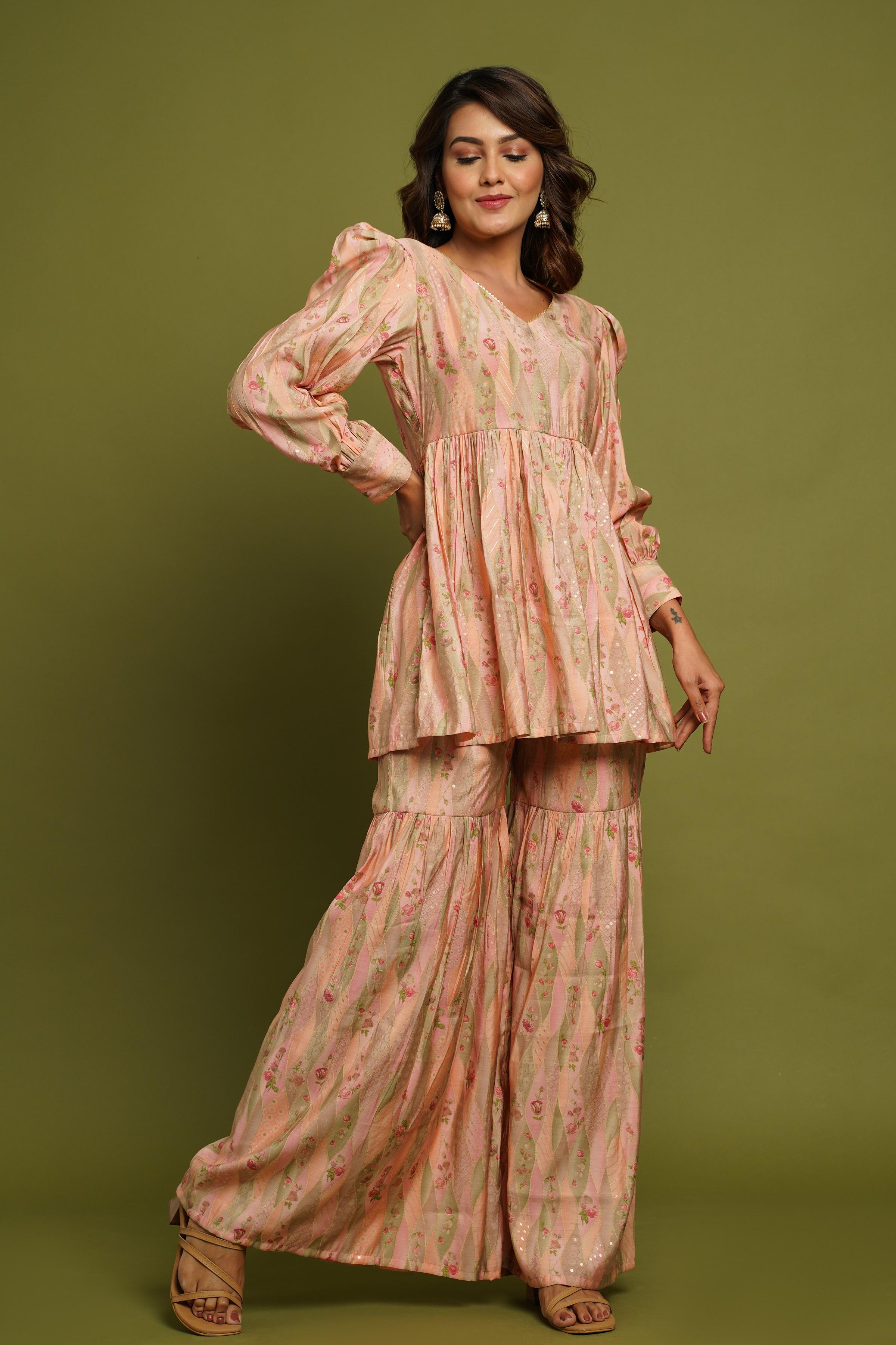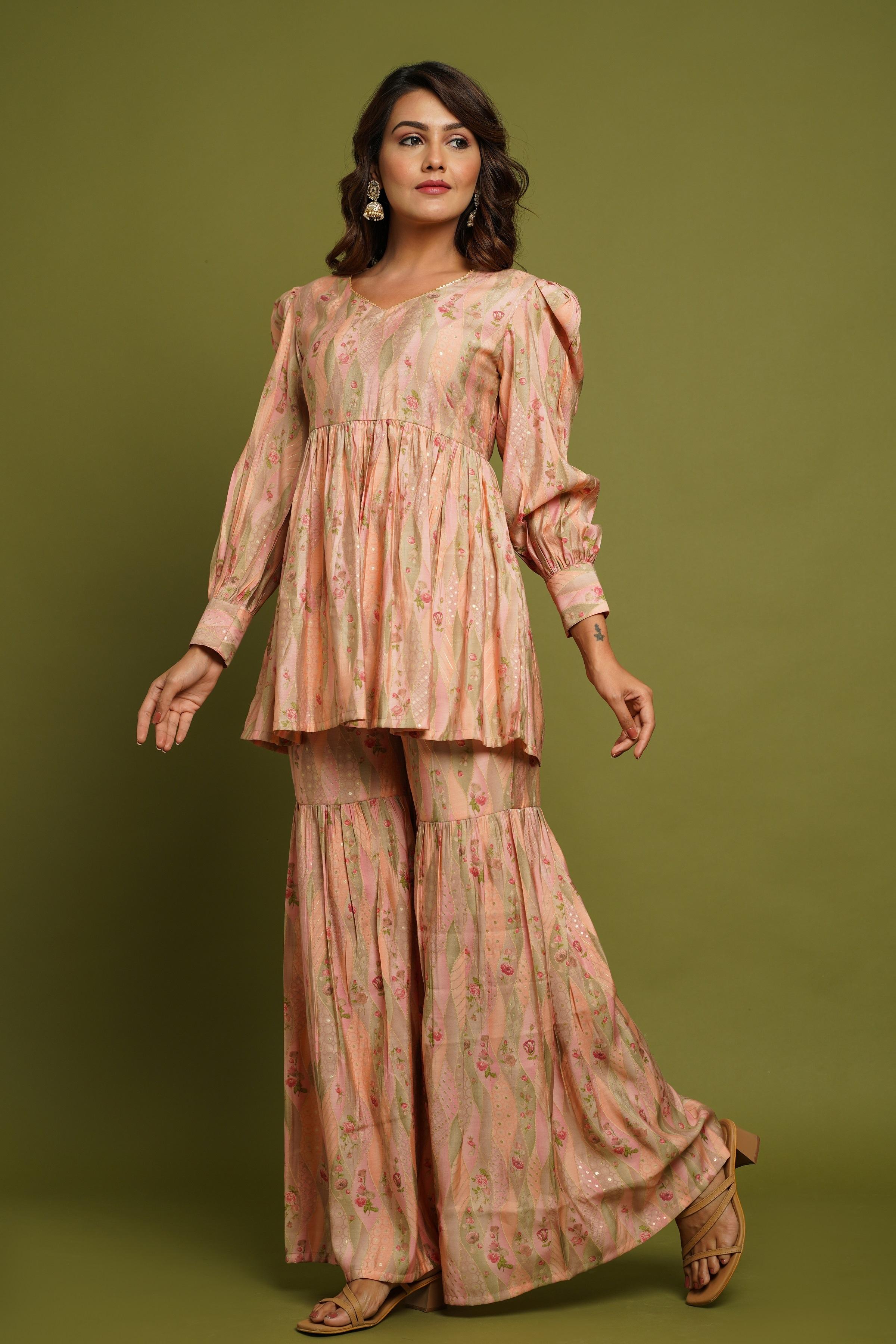 BEAUTIFUL PEACH PRINTED SWEETHEART NECK DESIGN CO-ORD SET