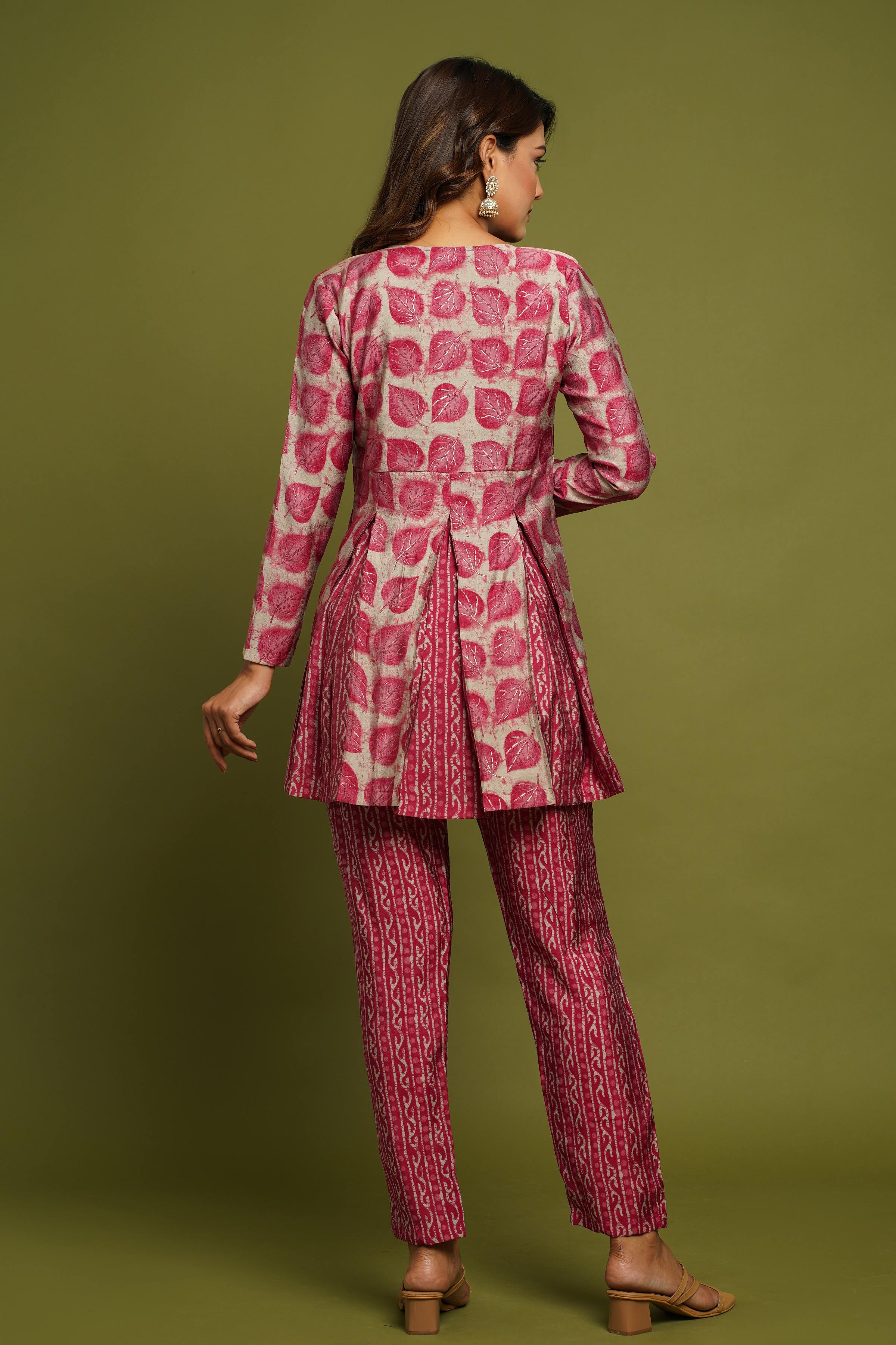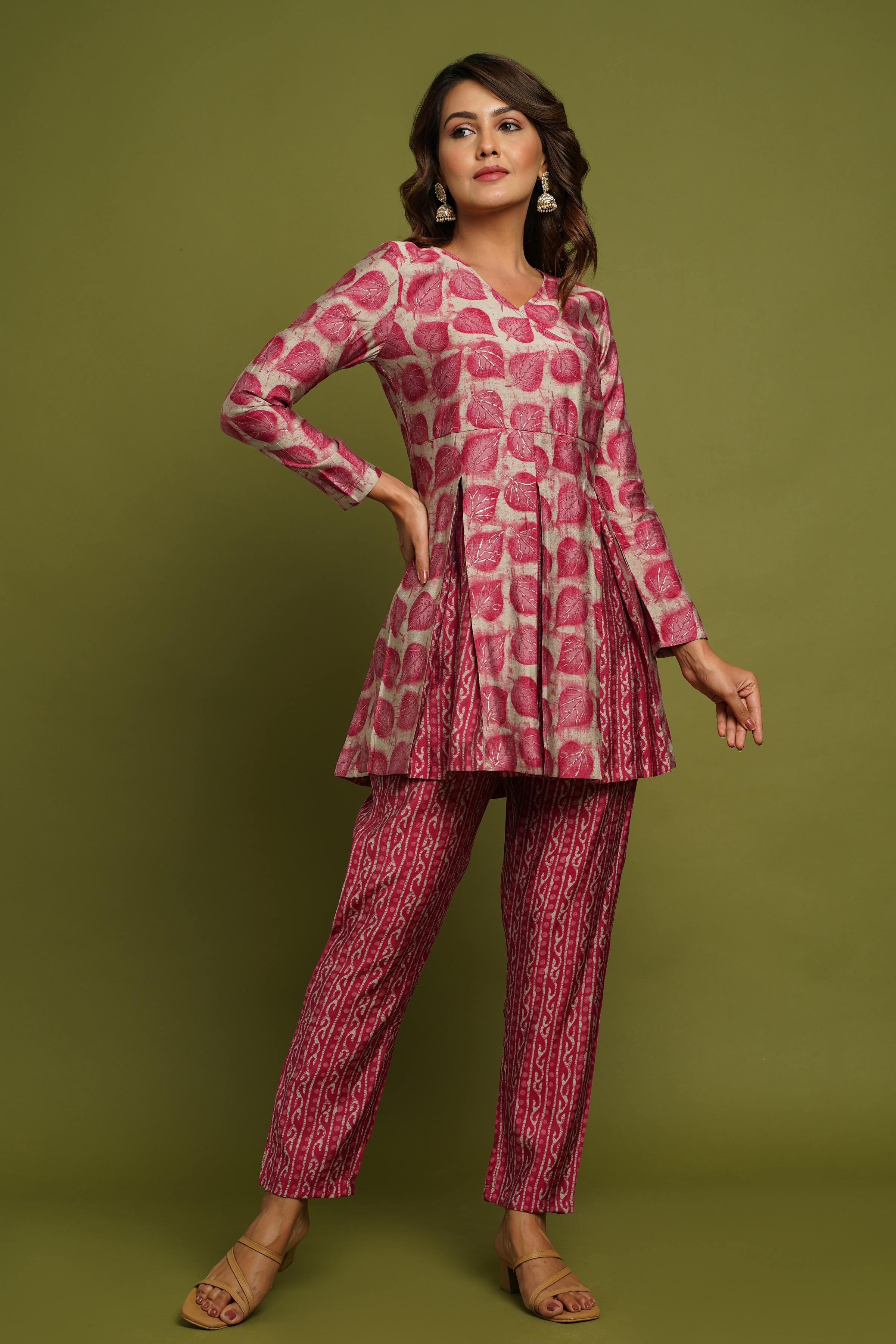BEAUTIFUL PINK PRINTED V-NECK DESIGN CO-ORD SET