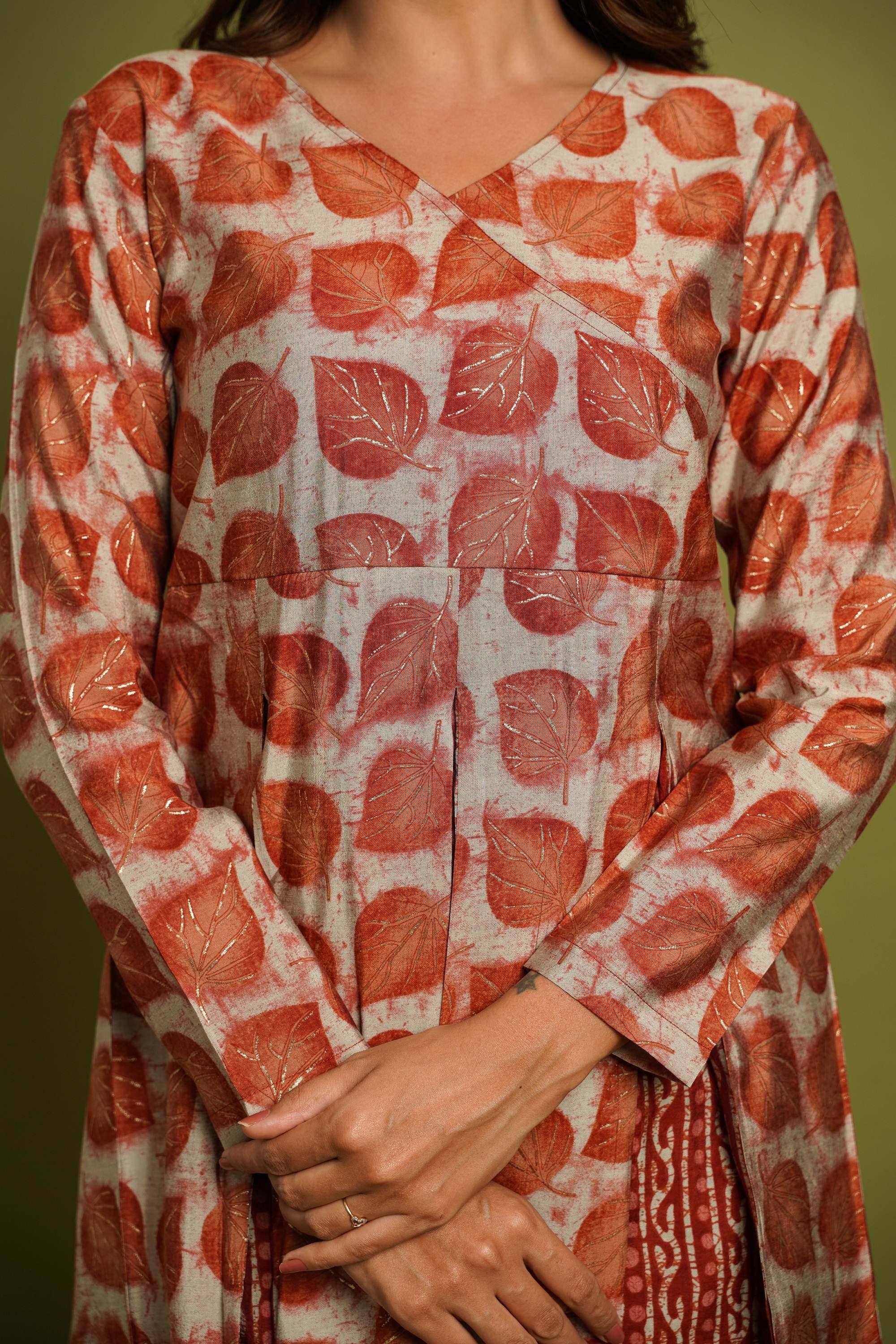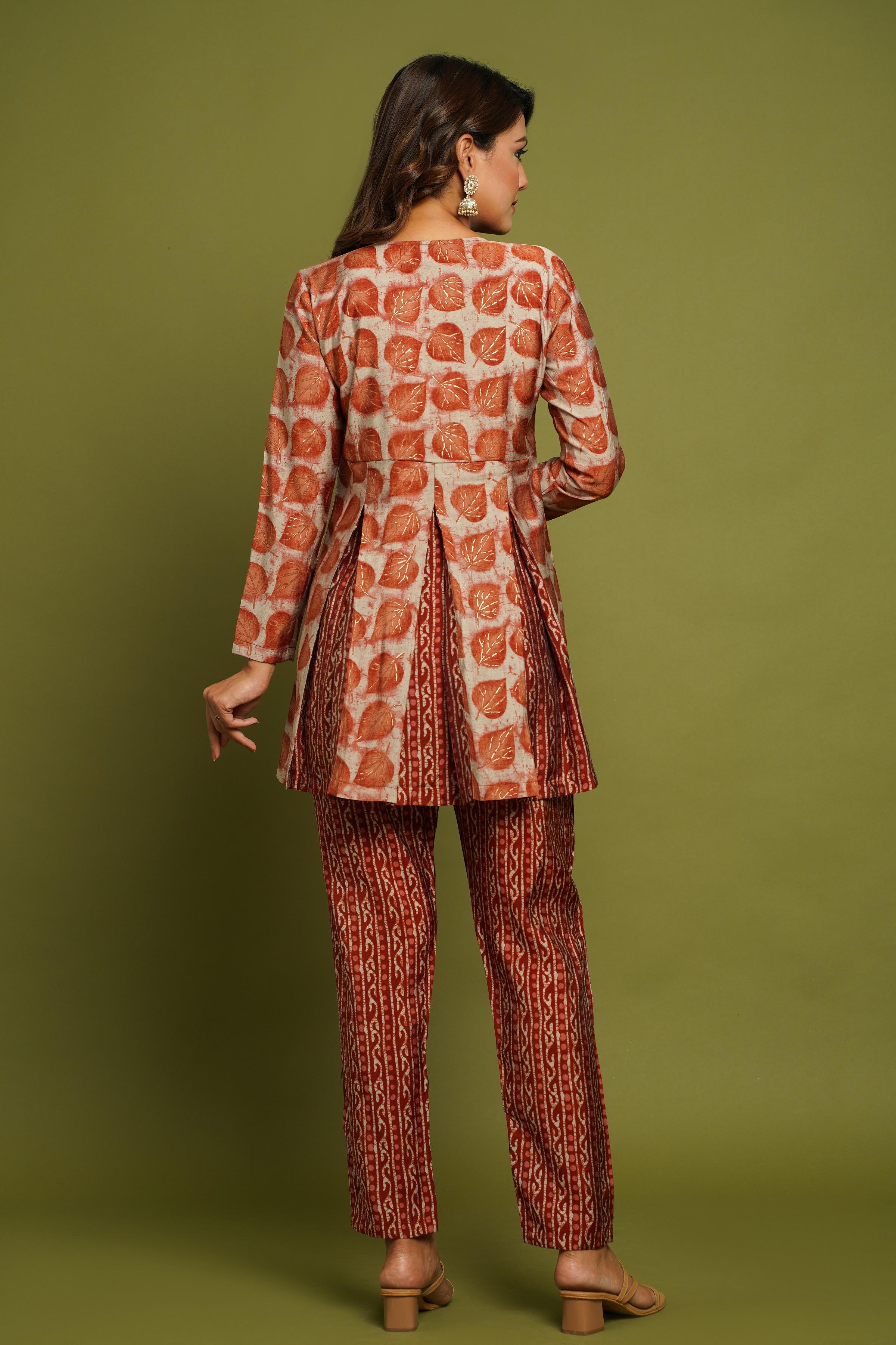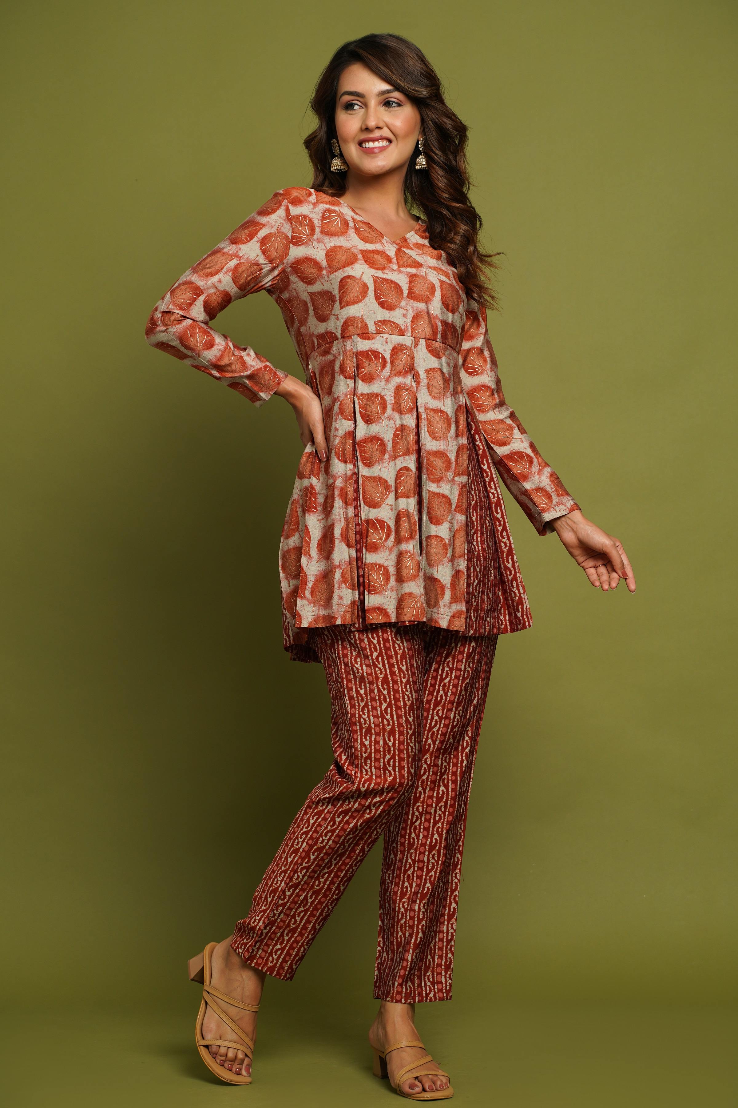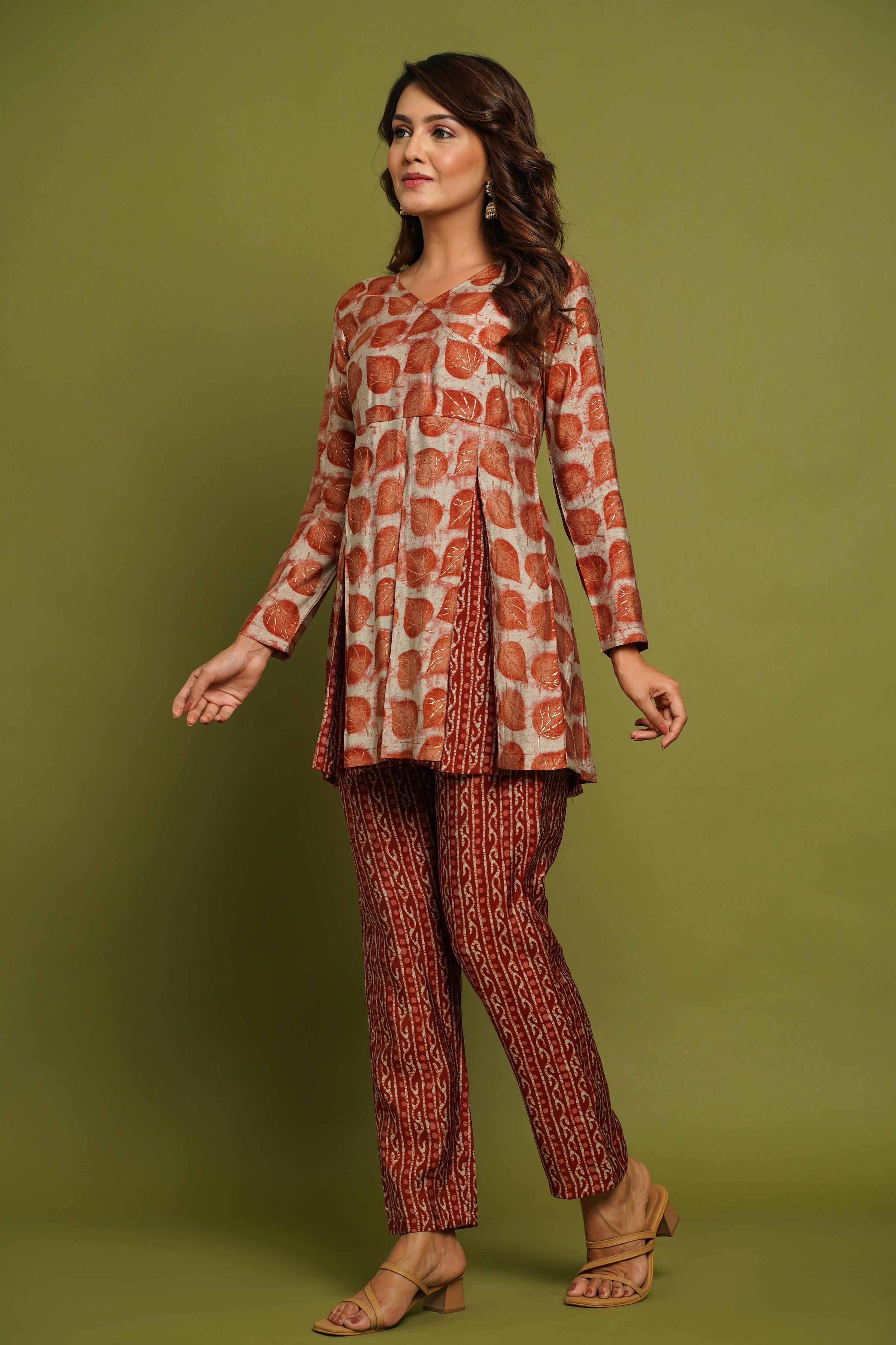 BEAUTIFUL RUST PRINTED V-NECK DESIGN CO-ORD SET