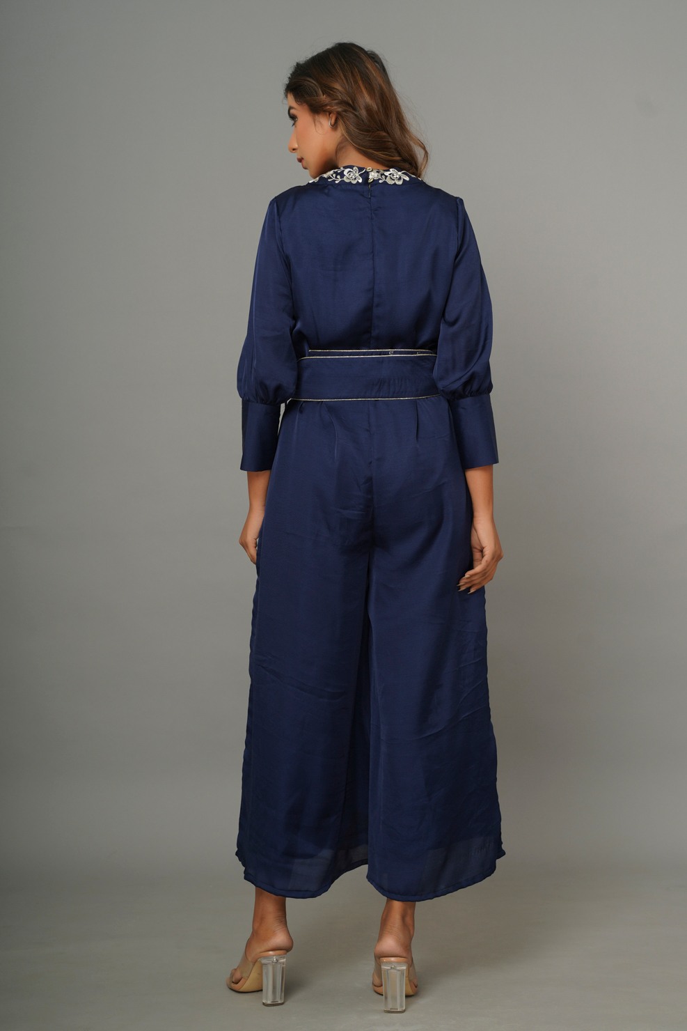 Blue Embroidery Work On Collar And Belt Jumpsuit