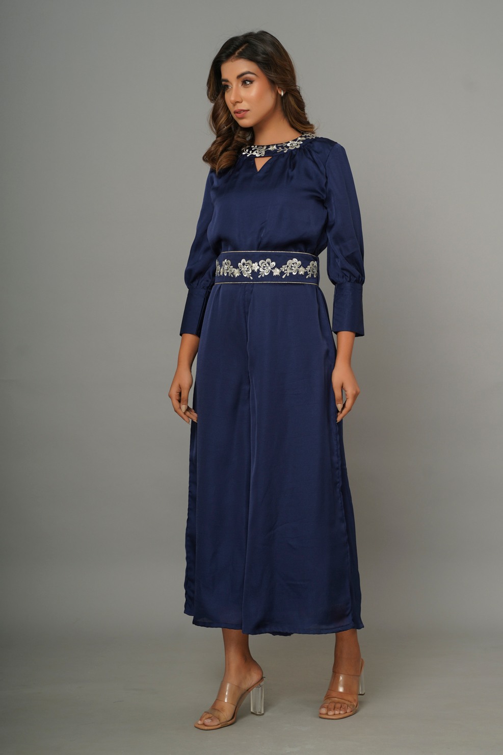 Blue Embroidery Work On Collar And Embroidery Belt Jumpsuit