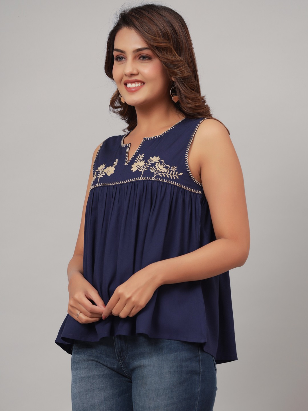 Blue Keyhole Neck Rayon Embroidery Gathered Top