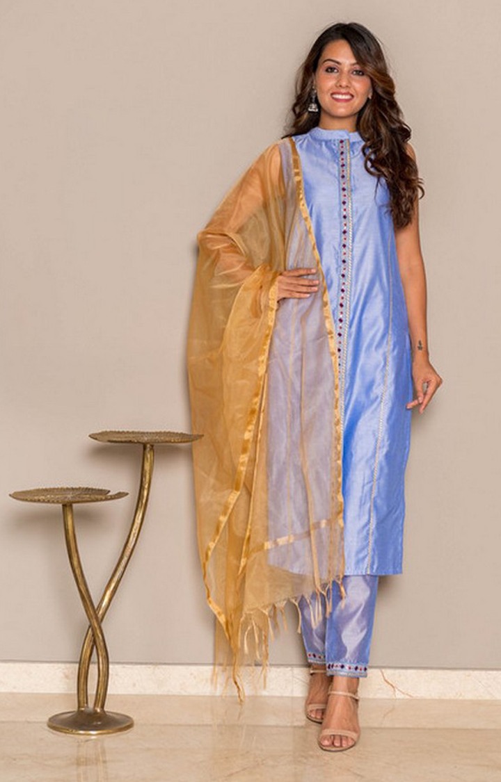 Flaunt a no-fuss look wearing this powder blue casual chandari straight emblish neck kurta set with orgenza dupatta. This set fabric is lightweight and assures the wearer a perfect fit & comfort. This stitched set beautified with latest trend & fashion as shown. Ideal for casual, kitty parties, outing & weekend get together. Pair it up with heels & stylish accessories. This attractive set will surely fetch you compliments for your rich sense of style. Note:- The actual product may differ slightly in color and design from the one illustrated in the images when compared with computer or mobile screen.