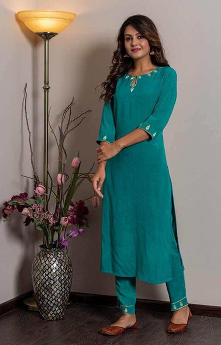 Attract compliments by this sky blue casual rayon dobby emblish kurta pant set. This set fabric is lightweight and assures the wearer a perfect fit & comfort. This stitched set beautified with latest trend & fashion as shown. Ideal for casual, kitty parties, outing & weekend get together. Pair it up with heels & stylish accessories. This attractive set will surely fetch you compliments for your rich sense of style. Note:- The actual product may differ slightly in color and design from the one illustrated in the images when compared with computer or mobile screen.