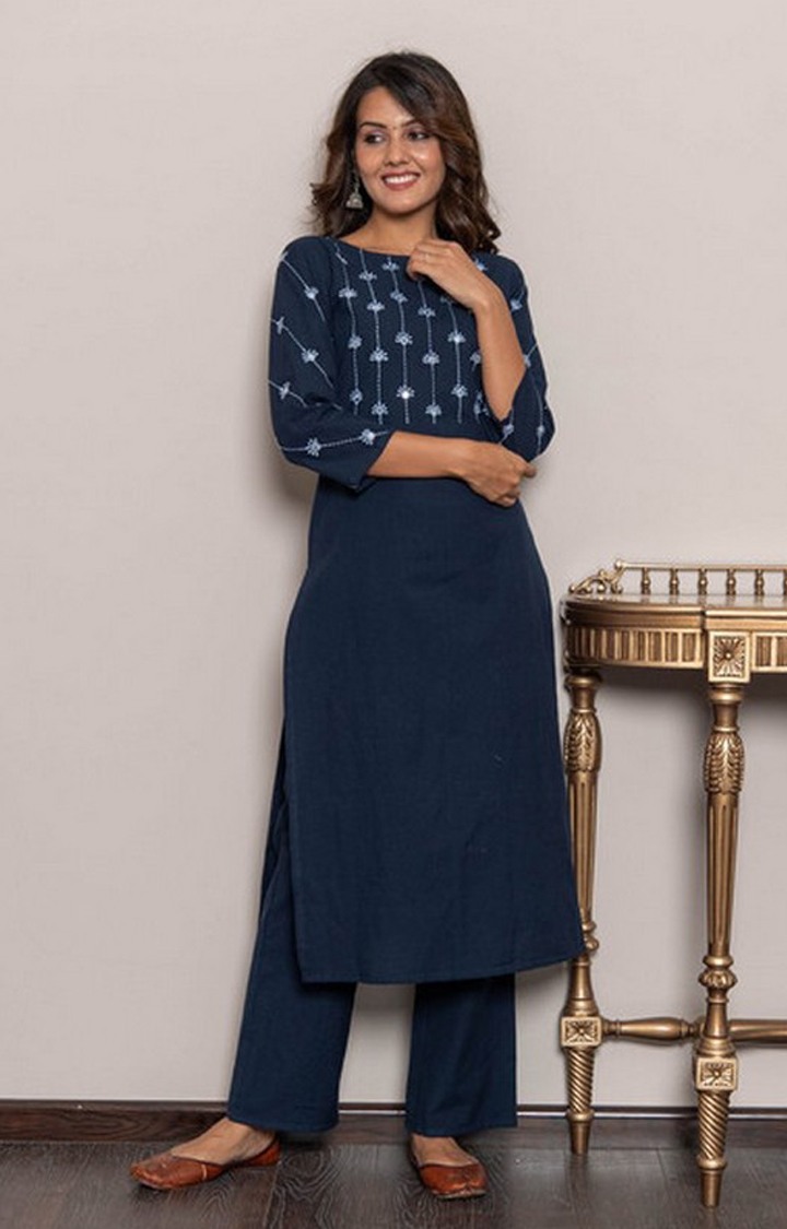 Keep ahead in fashion with this indigo blue casual emblish khadi kurta set. This set fabric is lightweight and assures the wearer a perfect fit & comfort. This stitched set beautified with latest trend & fashion as shown. Ideal for casual, kitty parties, outing & weekend get together. Pair it up with heels & stylish accessories. This attractive set will surely fetch you compliments for your rich sense of style. Note:- The actual product may differ slightly in color and design from the one illustrated in the images when compared with computer or mobile screen.