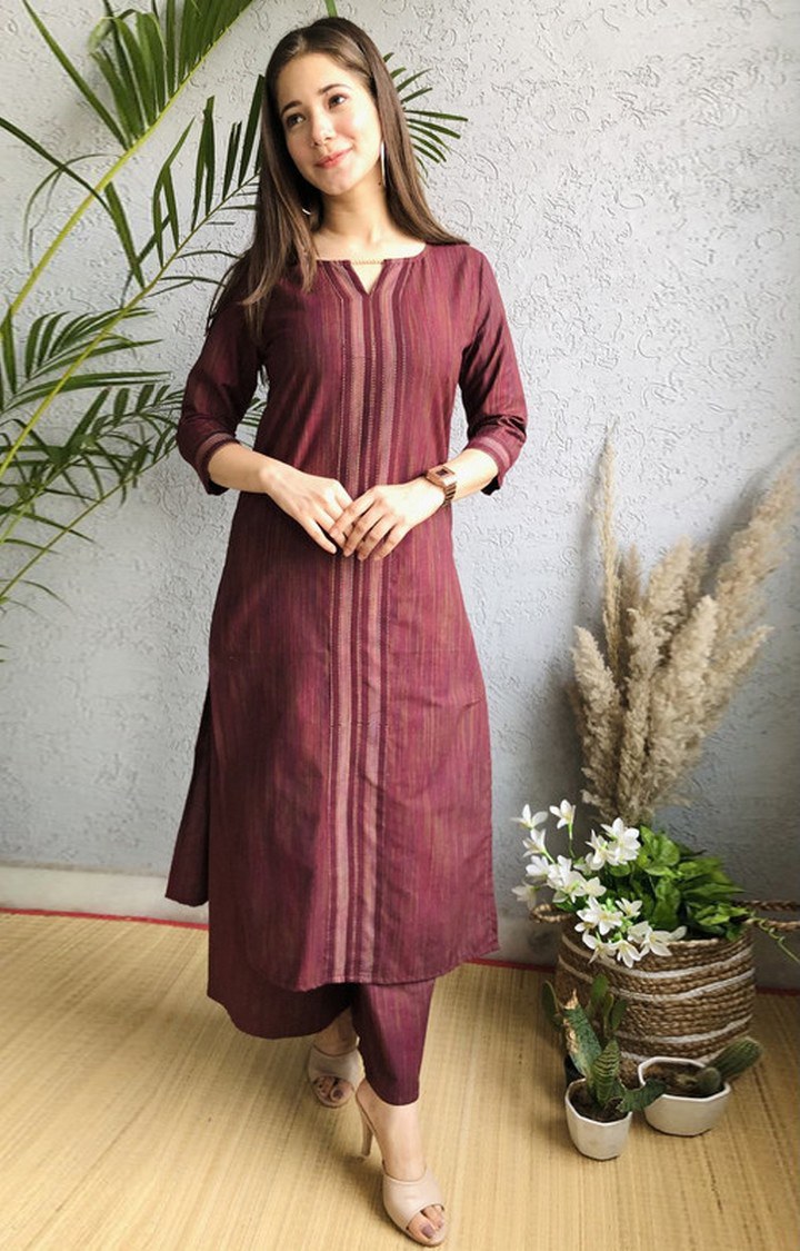 Make guys adore your sartorial elegance, when you wear this maroon casual string neck straight kurta with palazzo. This set fabric is lightweight and assures the wearer a perfect fit & comfort. This stitched set beautified with latest trend & fashion as shown. Ideal for casual, kitty parties, outing & weekend get together. Pair it up with heels & stylish accessories. This attractive set will surely fetch you compliments for your rich sense of style. Note:- The actual product may differ slightly in color and design from the one illustrated in the images when compared with computer or mobile screen.