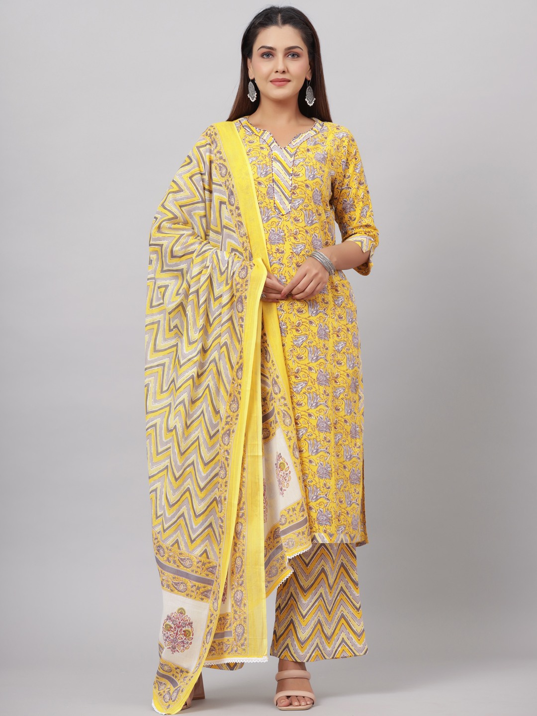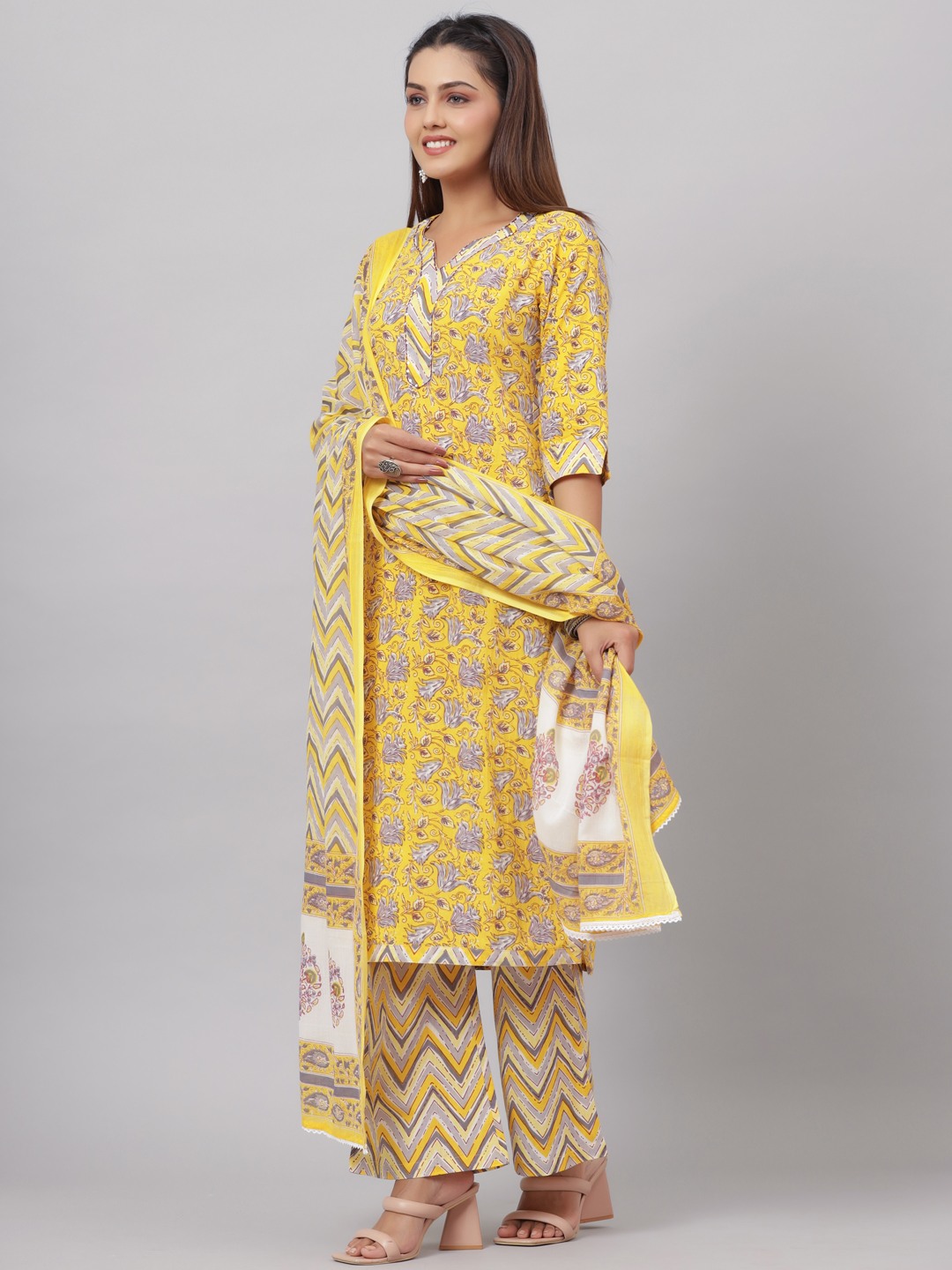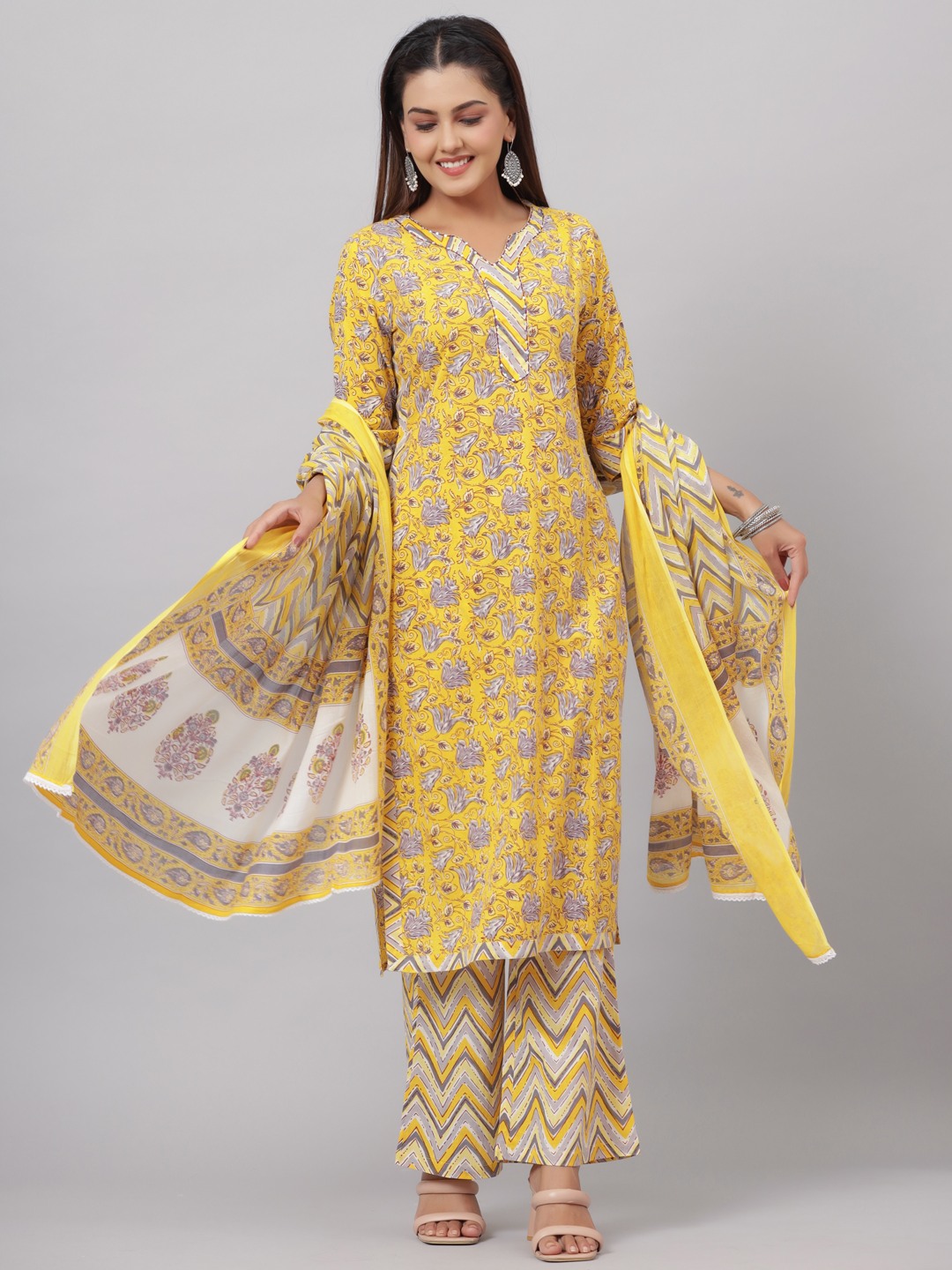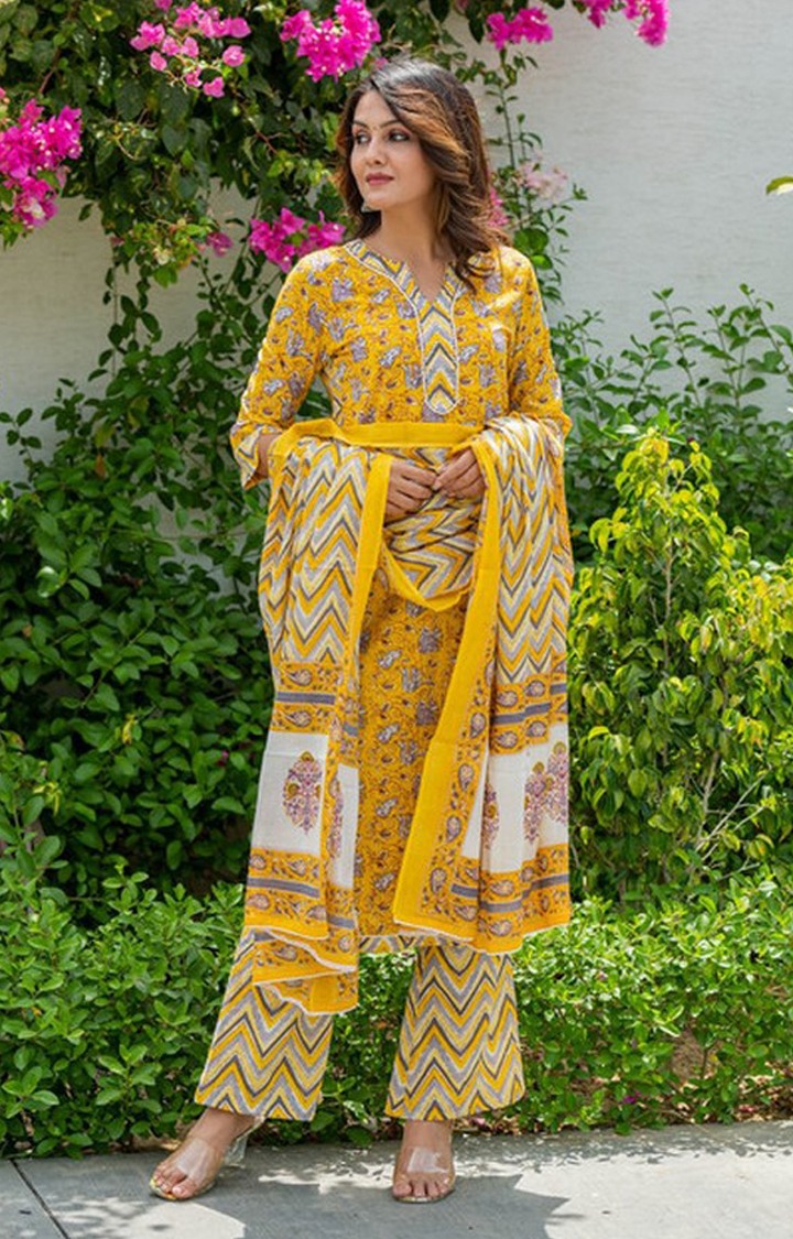 Add grace and charm on your appearance in this yellow casual floral printed lace kurta palazzo set with dupatta. This set fabric is lightweight and assures the wearer a perfect fit & comfort. This stitched set beautified with latest trend & fashion as shown. Ideal for casual, kitty parties, outing & weekend get together. Pair it up with heels & stylish accessories. This attractive set will surely fetch you compliments for your rich sense of style. Note:- The actual product may differ slightly in color and design from the one illustrated in the images when compared with computer or mobile screen.