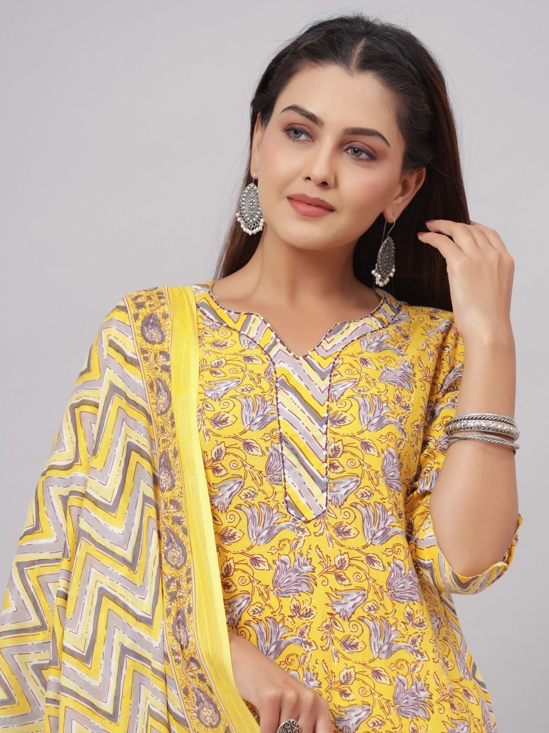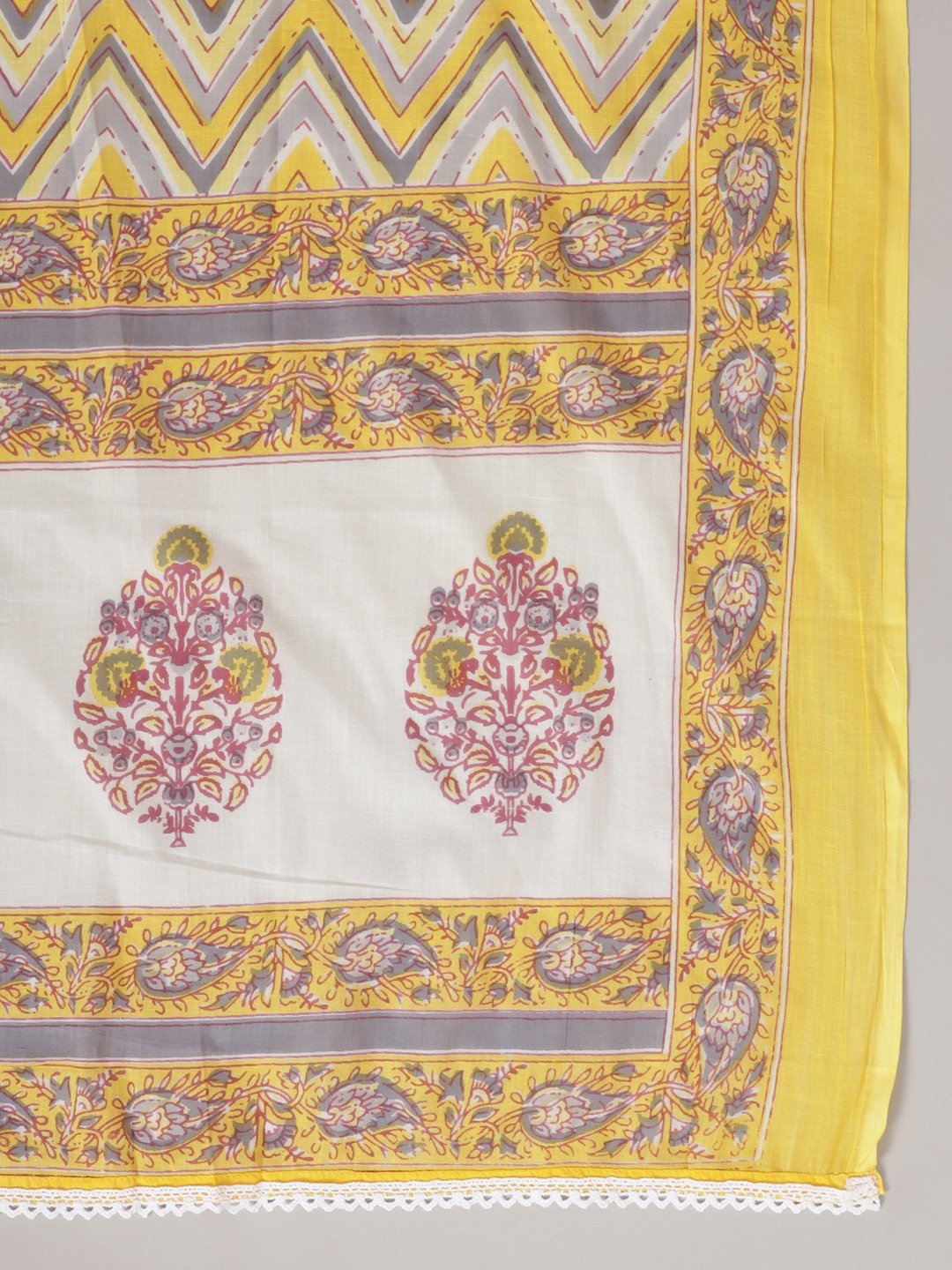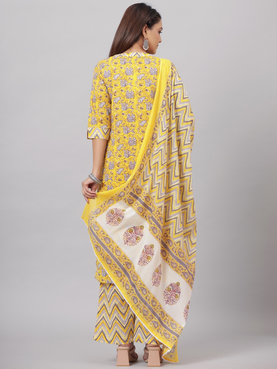 Add grace and charm on your appearance in this yellow casual floral printed lace kurta palazzo set with dupatta. This set fabric is lightweight and assures the wearer a perfect fit & comfort. This stitched set beautified with latest trend & fashion as shown. Ideal for casual, kitty parties, outing & weekend get together. Pair it up with heels & stylish accessories. This attractive set will surely fetch you compliments for your rich sense of style. Note:- The actual product may differ slightly in color and design from the one illustrated in the images when compared with computer or mobile screen.