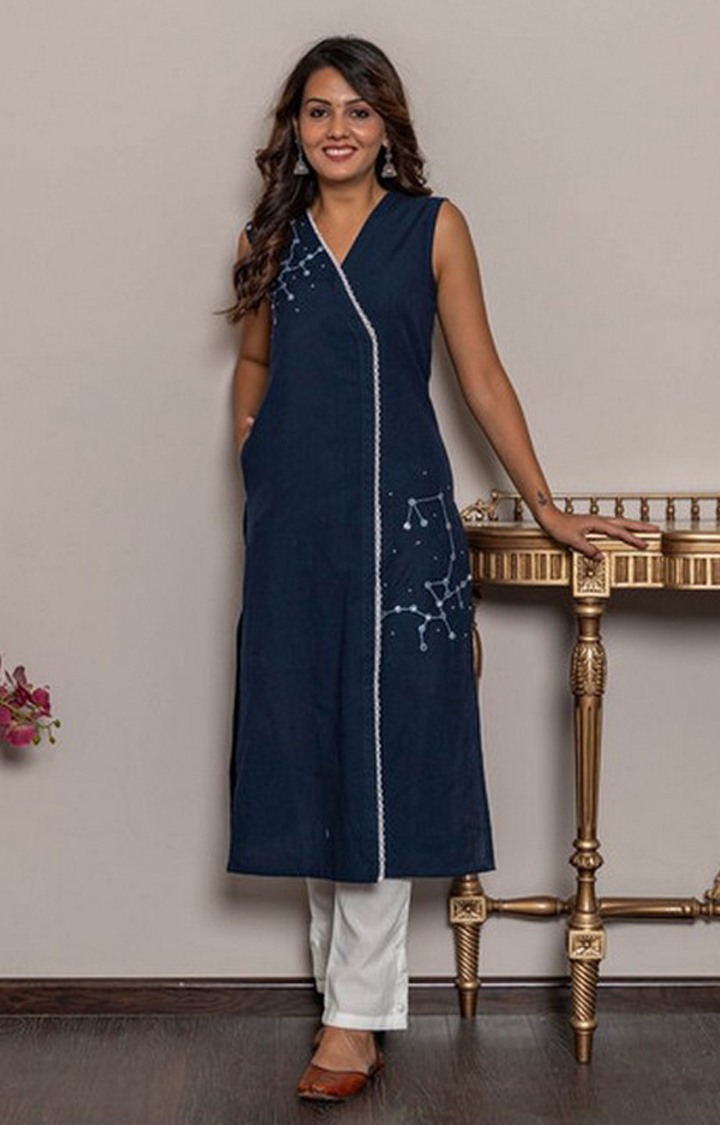 Steal the hearts away with this indigo blue casual kurta pant set with moon sign emblish. This set fabric is lightweight and assures the wearer a perfect fit & comfort. This stitched set beautified with latest trend & fashion as shown. Ideal for casual, kitty parties, outing & weekend get together. Pair it up with heels & stylish accessories. This attractive set will surely fetch you compliments for your rich sense of style. Note:- The actual product may differ slightly in color and design from the one illustrated in the images when compared with computer or mobile screen.