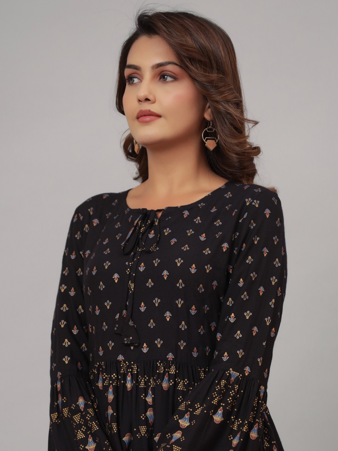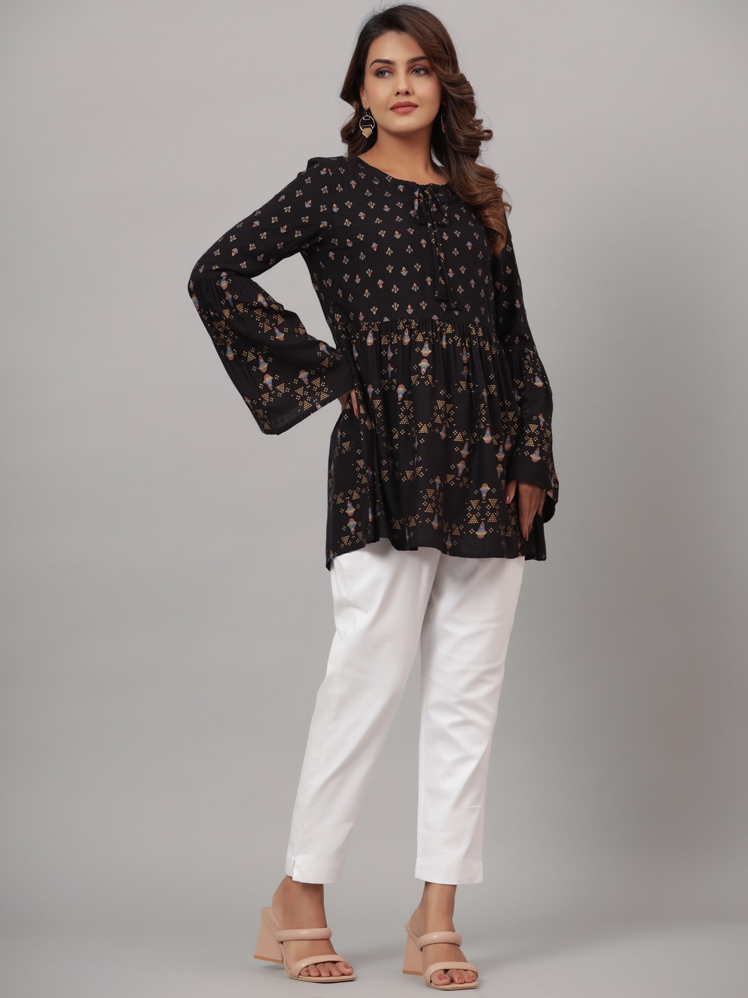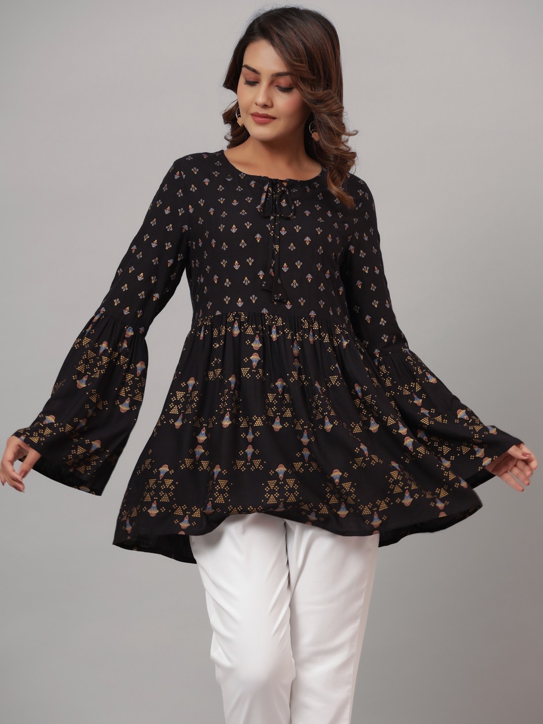 Black Rayon Printed Flared Top