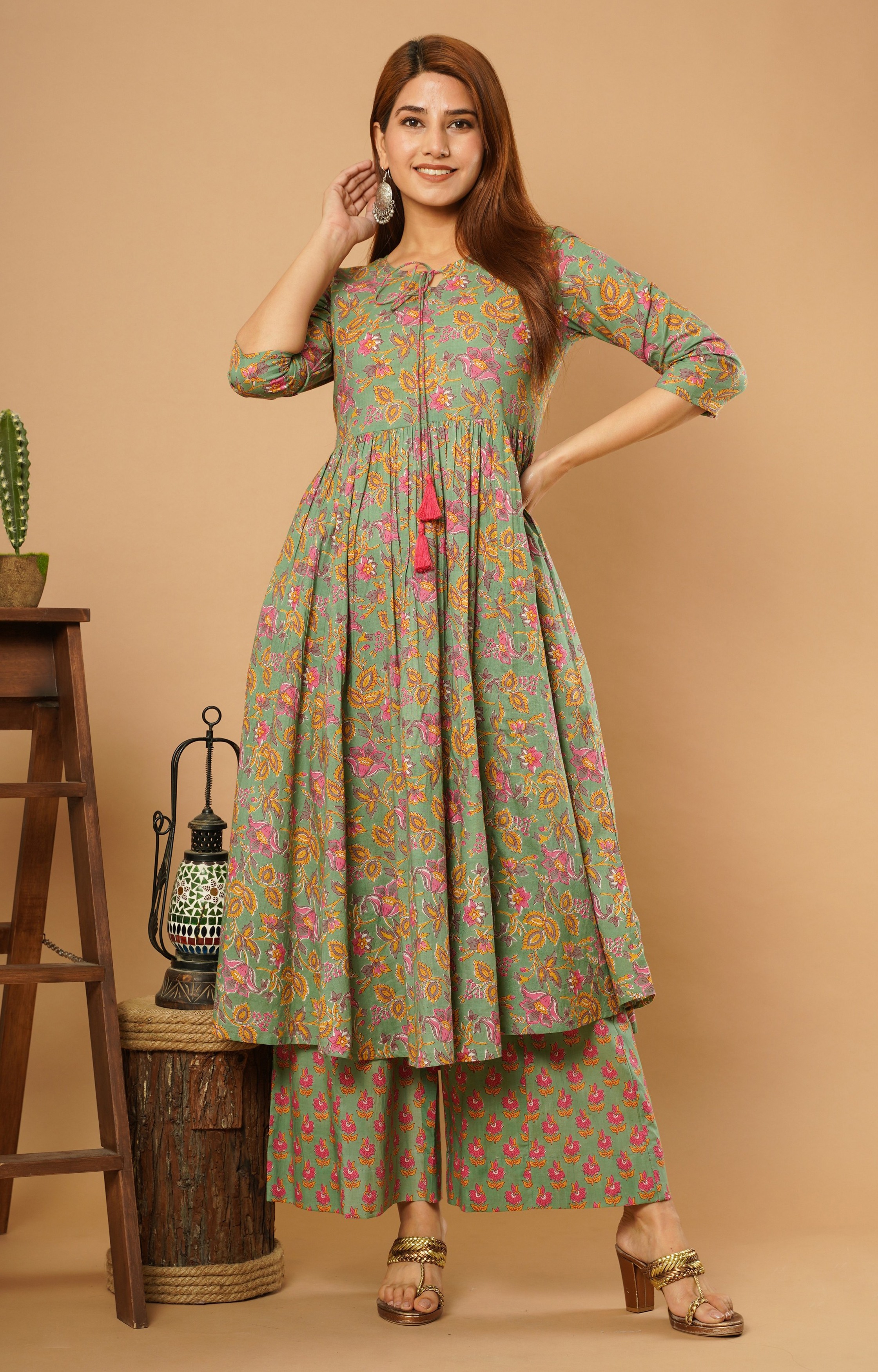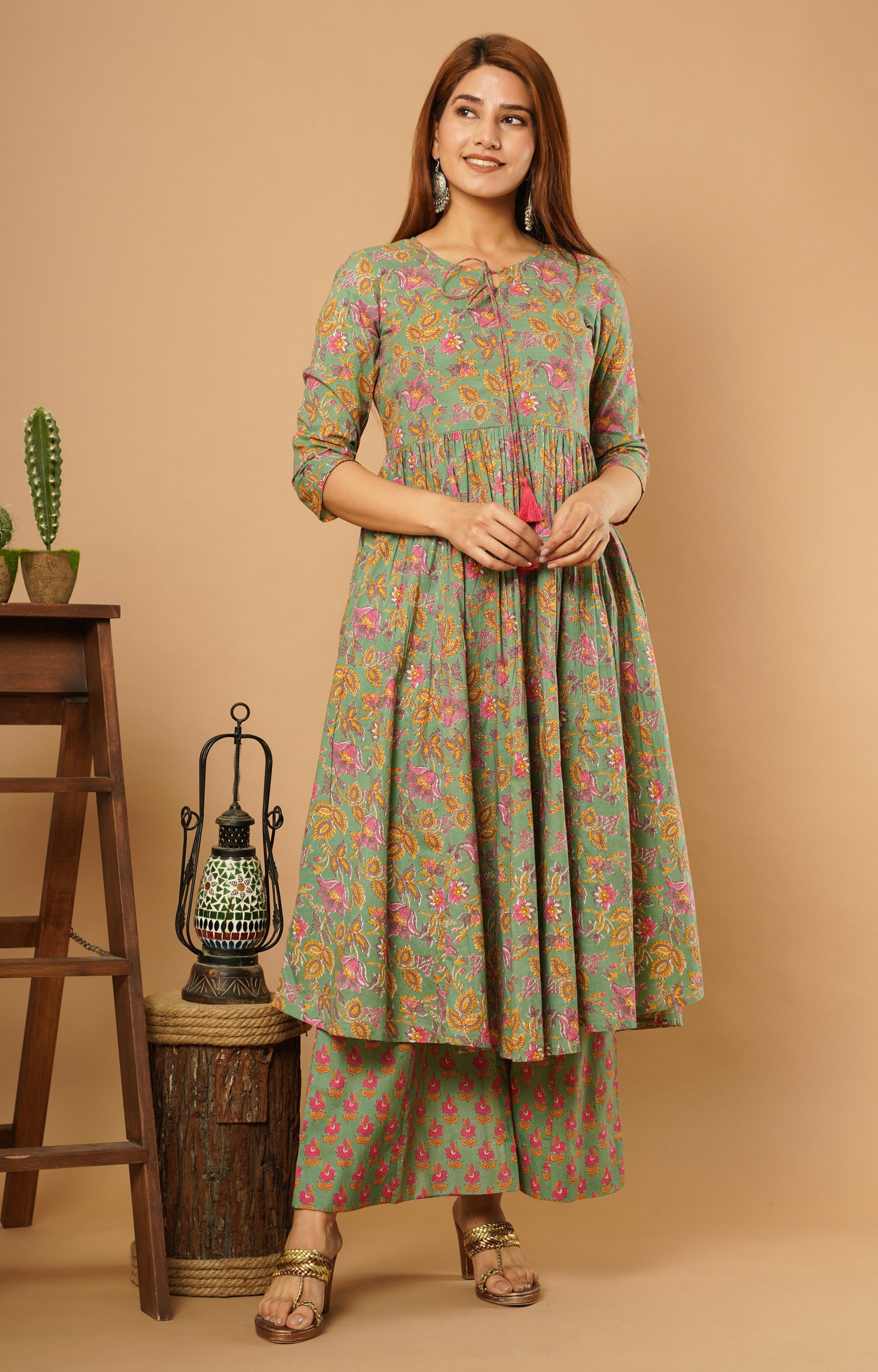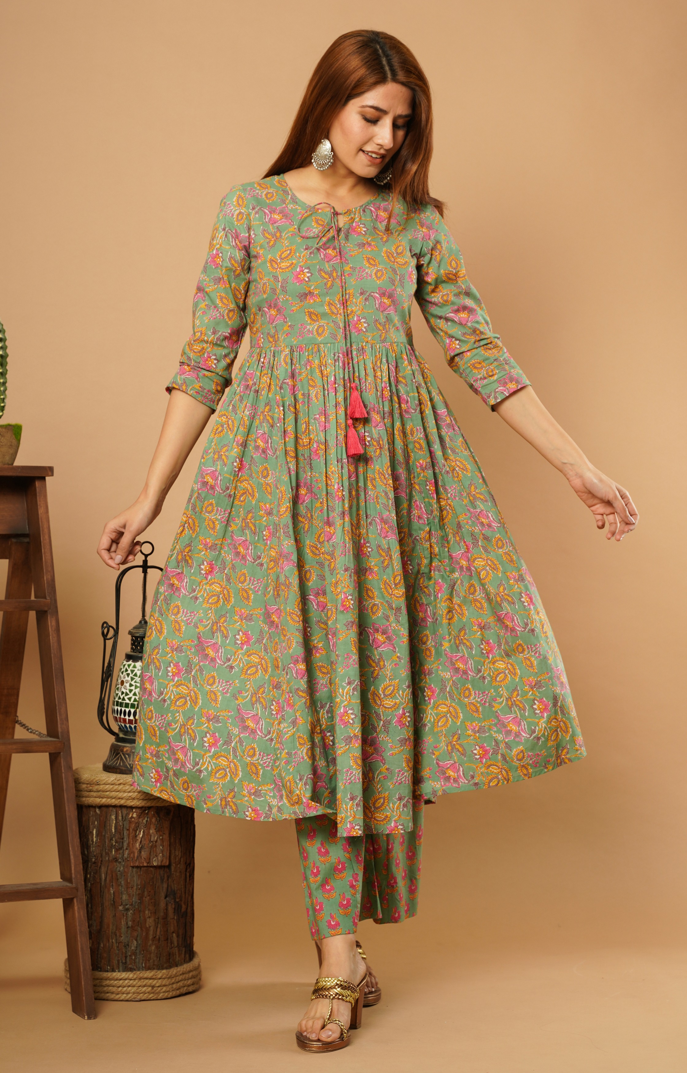 PRINTED FLAYERD GEATHER KURTA WITH PANT