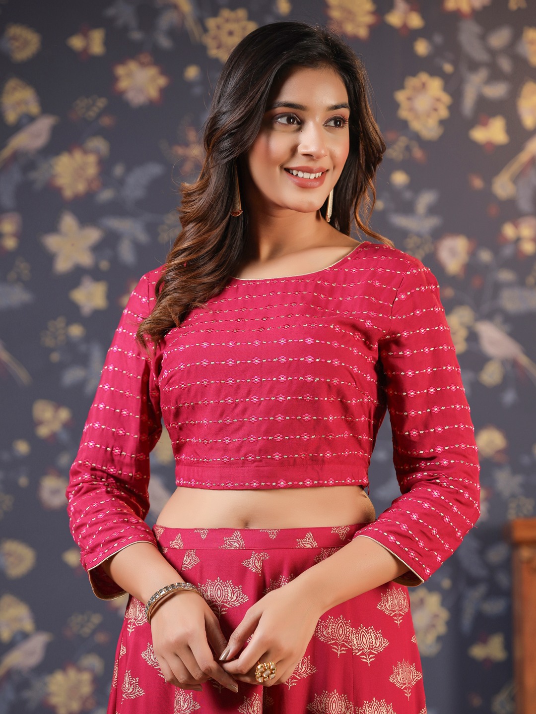 Blouse fabric: 100% PolyesterLehenga fabric: 100% PolyesterLehenga lining fabric: 100% Cotton