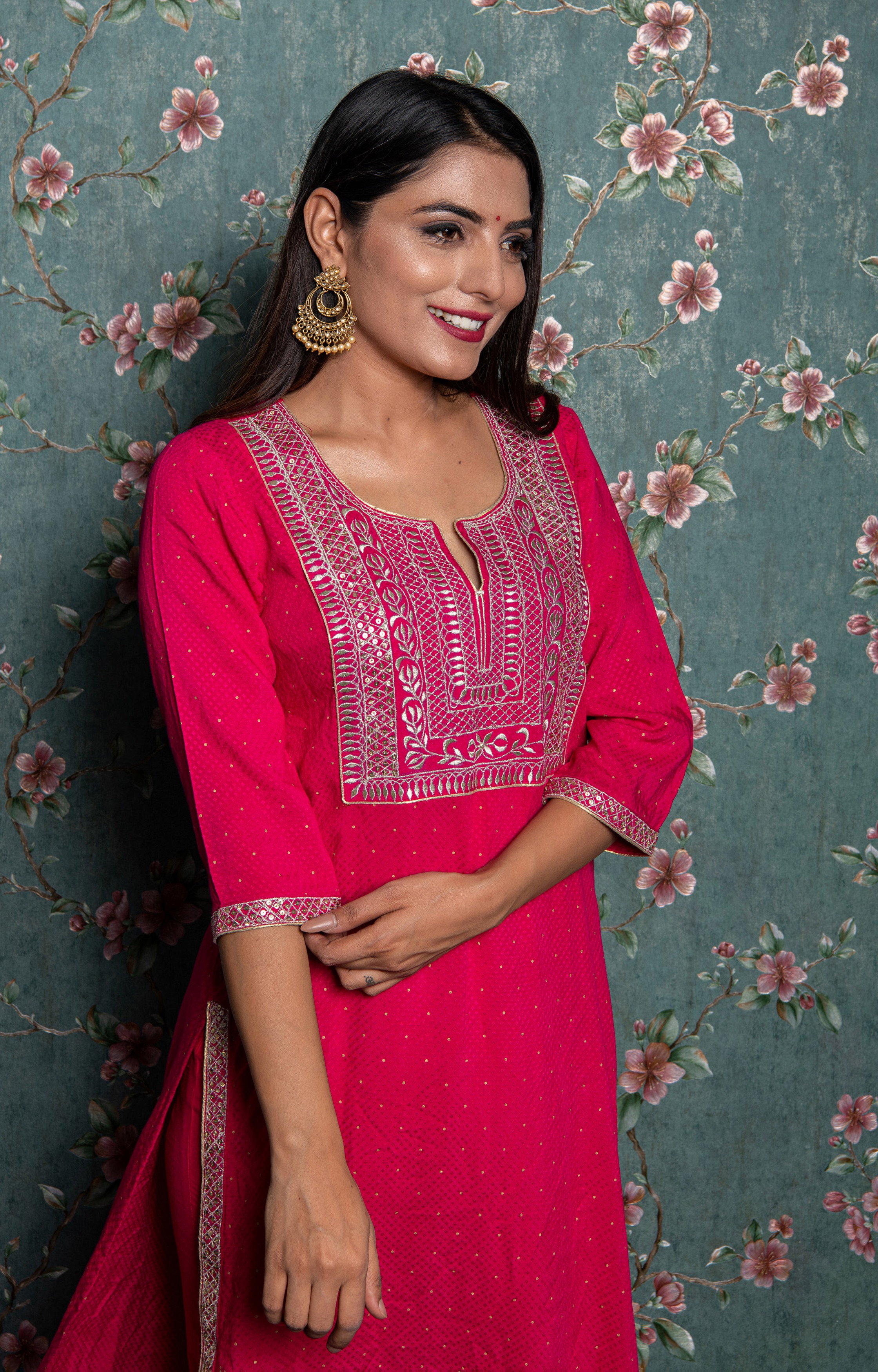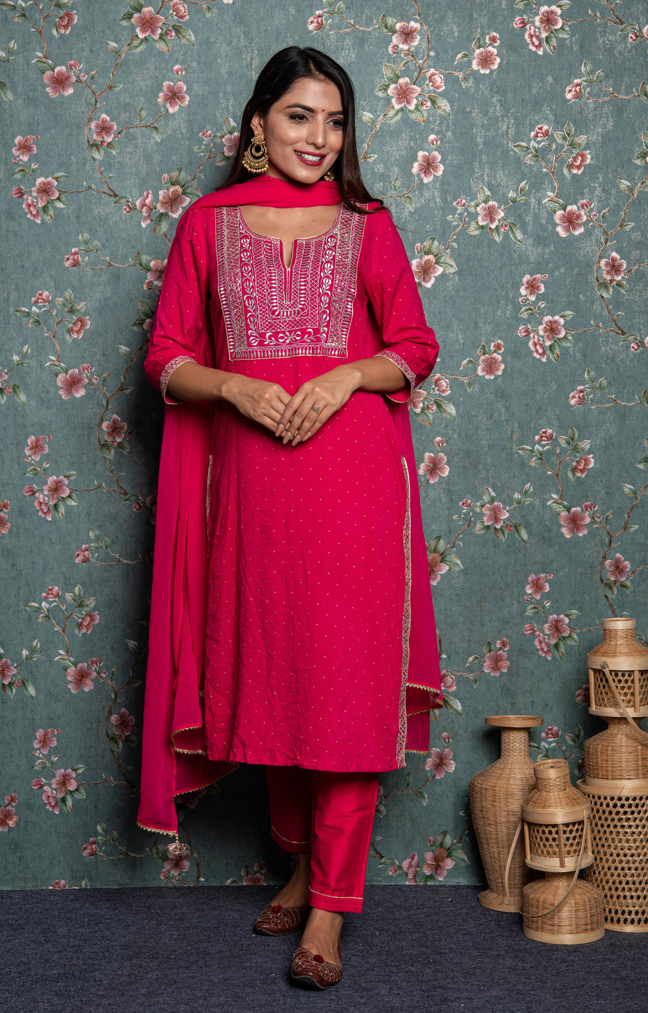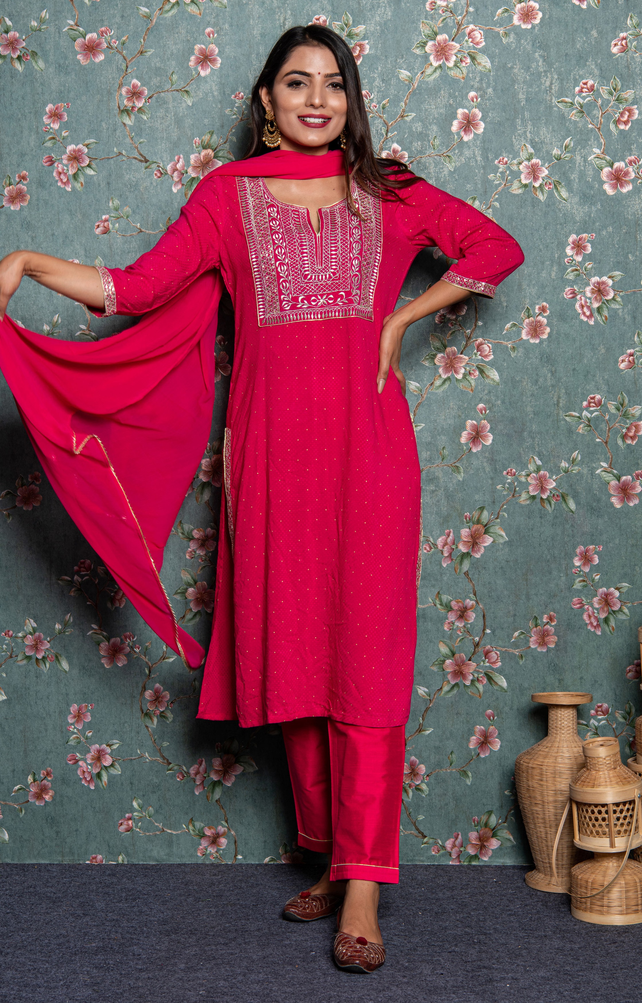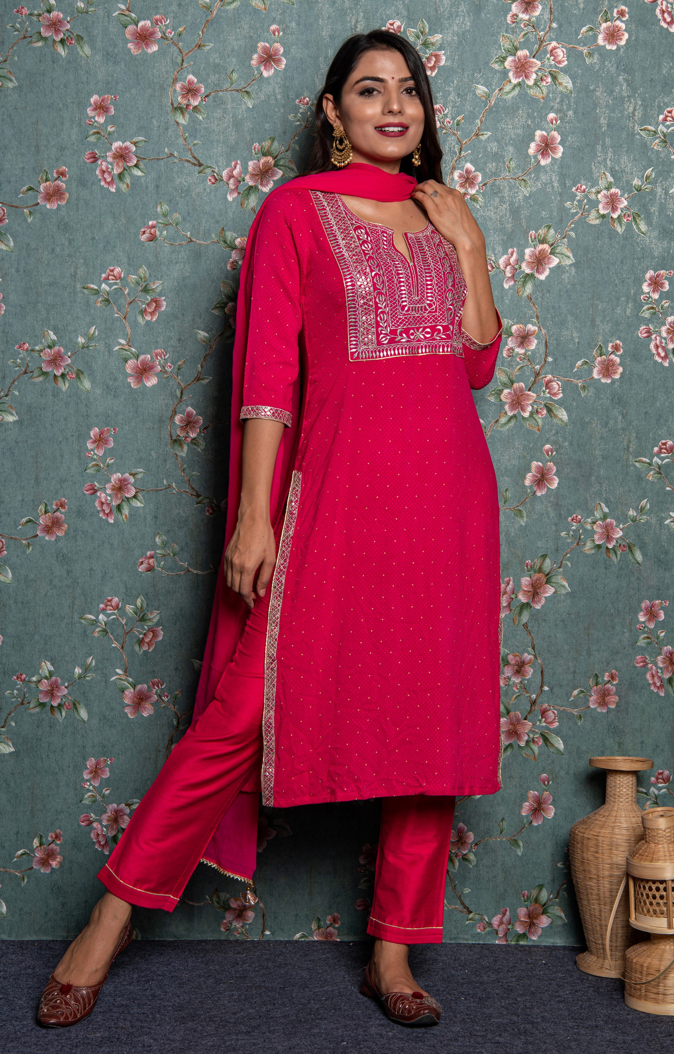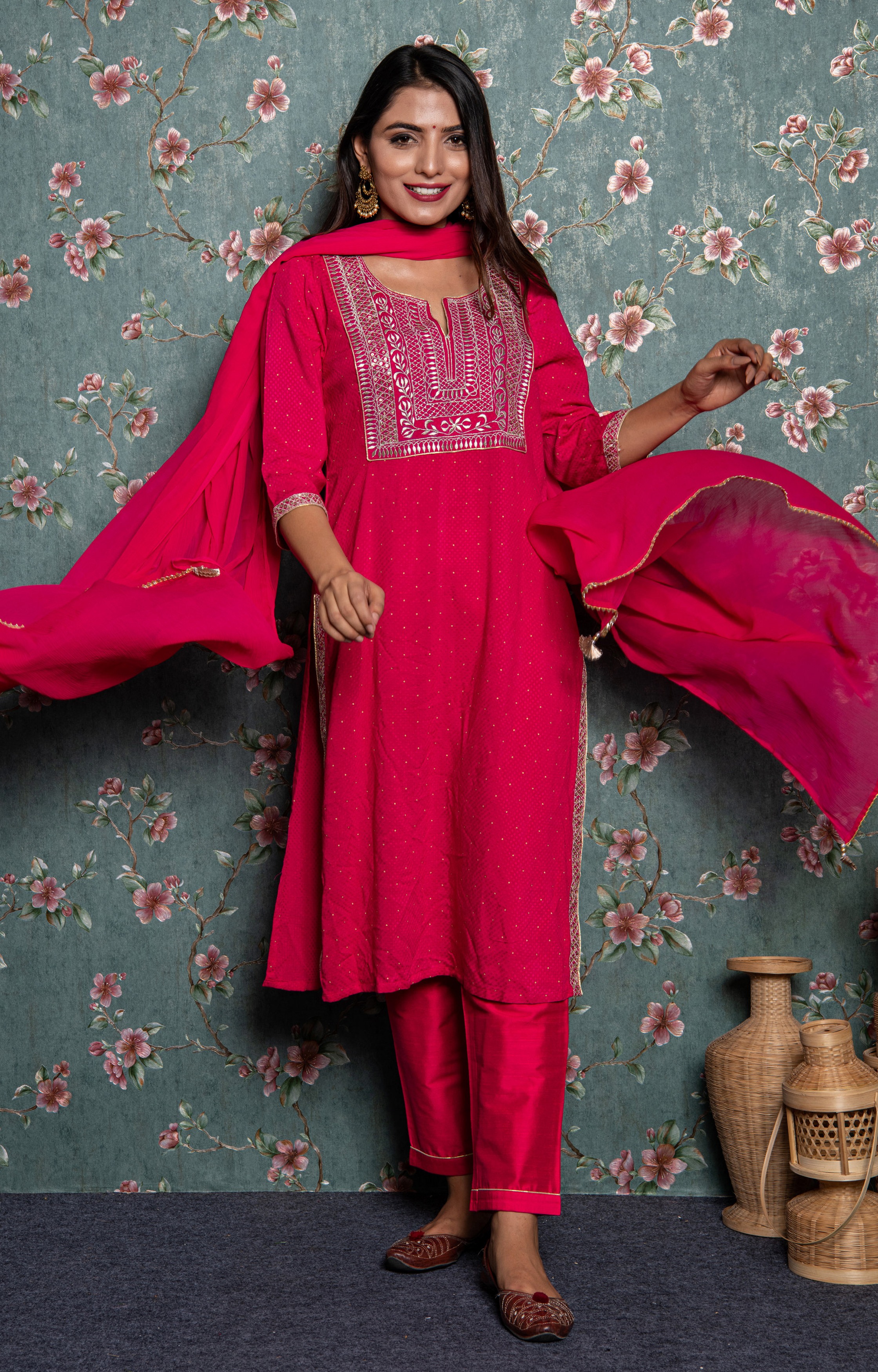 Rani Pink Embroidered Kurta Pant Set with Dupatta