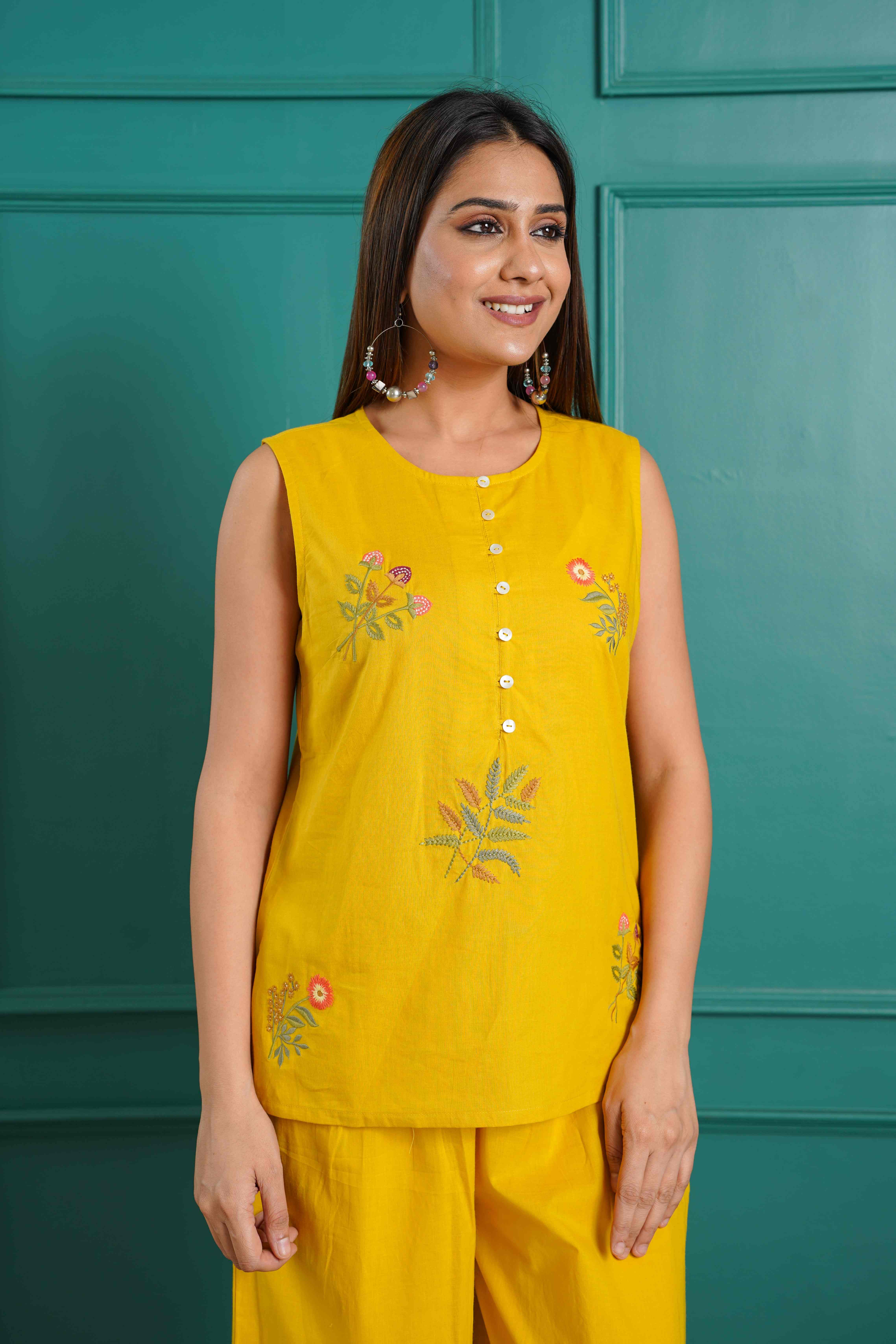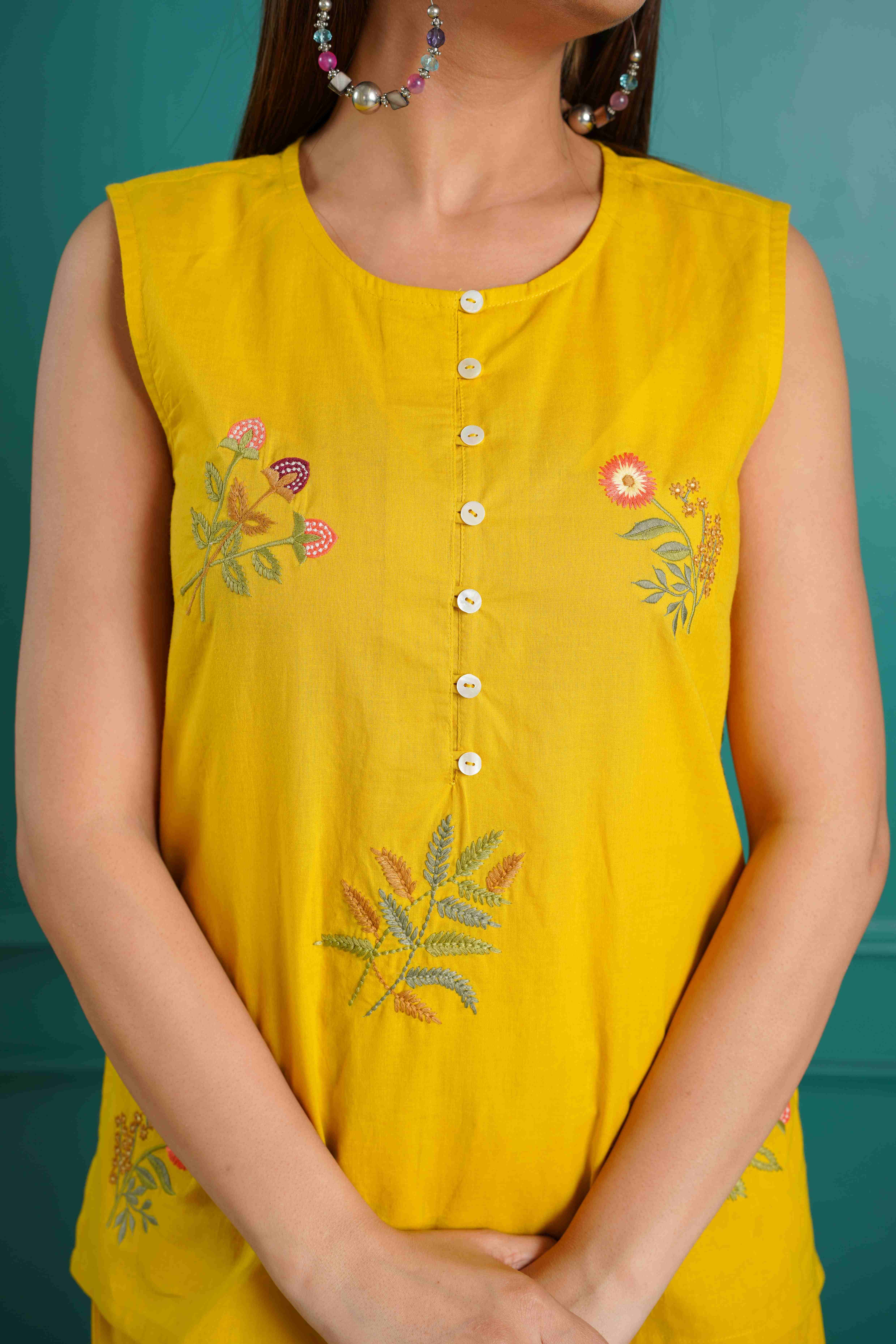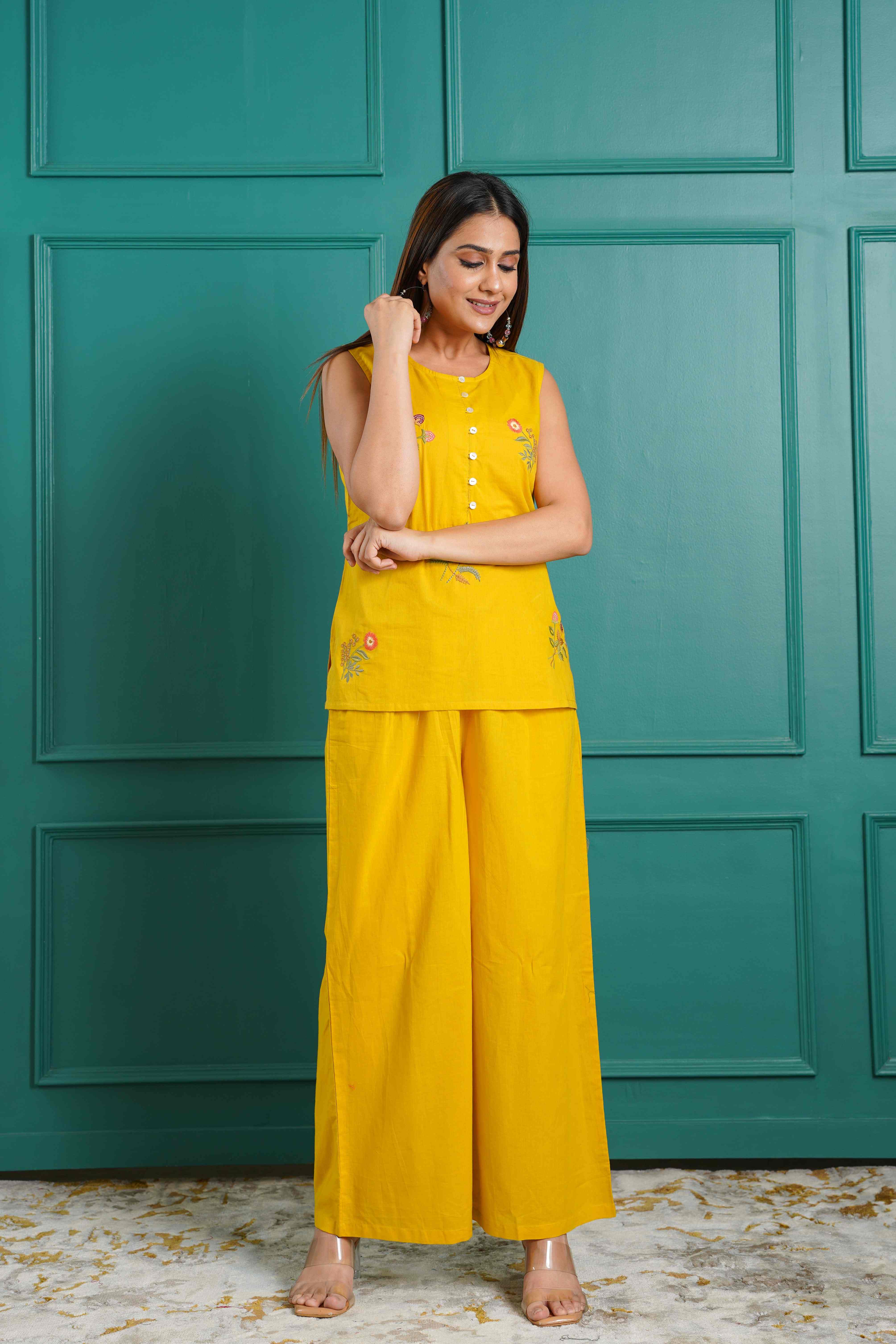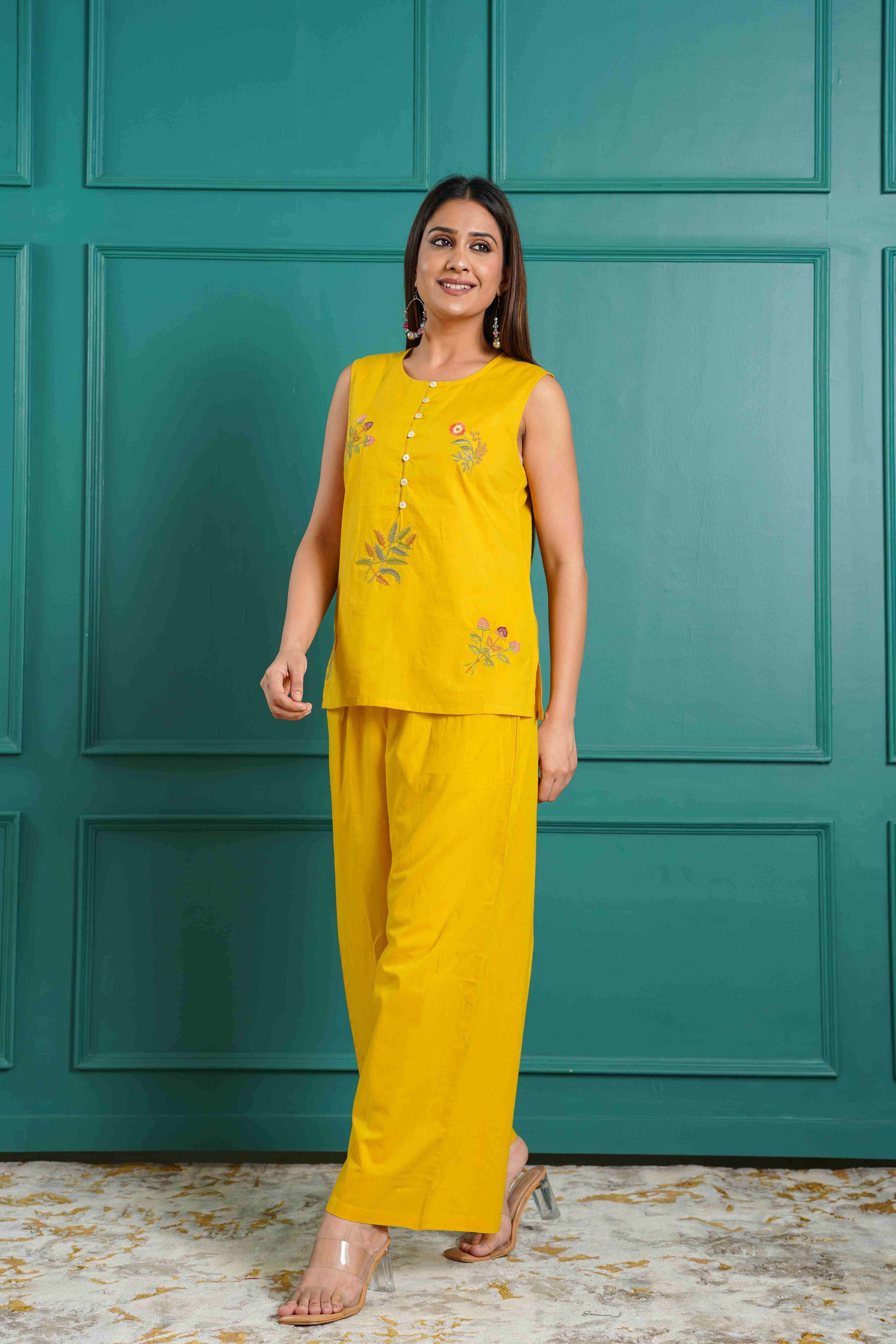MUSTARD FLORAL EMBROIDERED COTTON CO-ORD SET