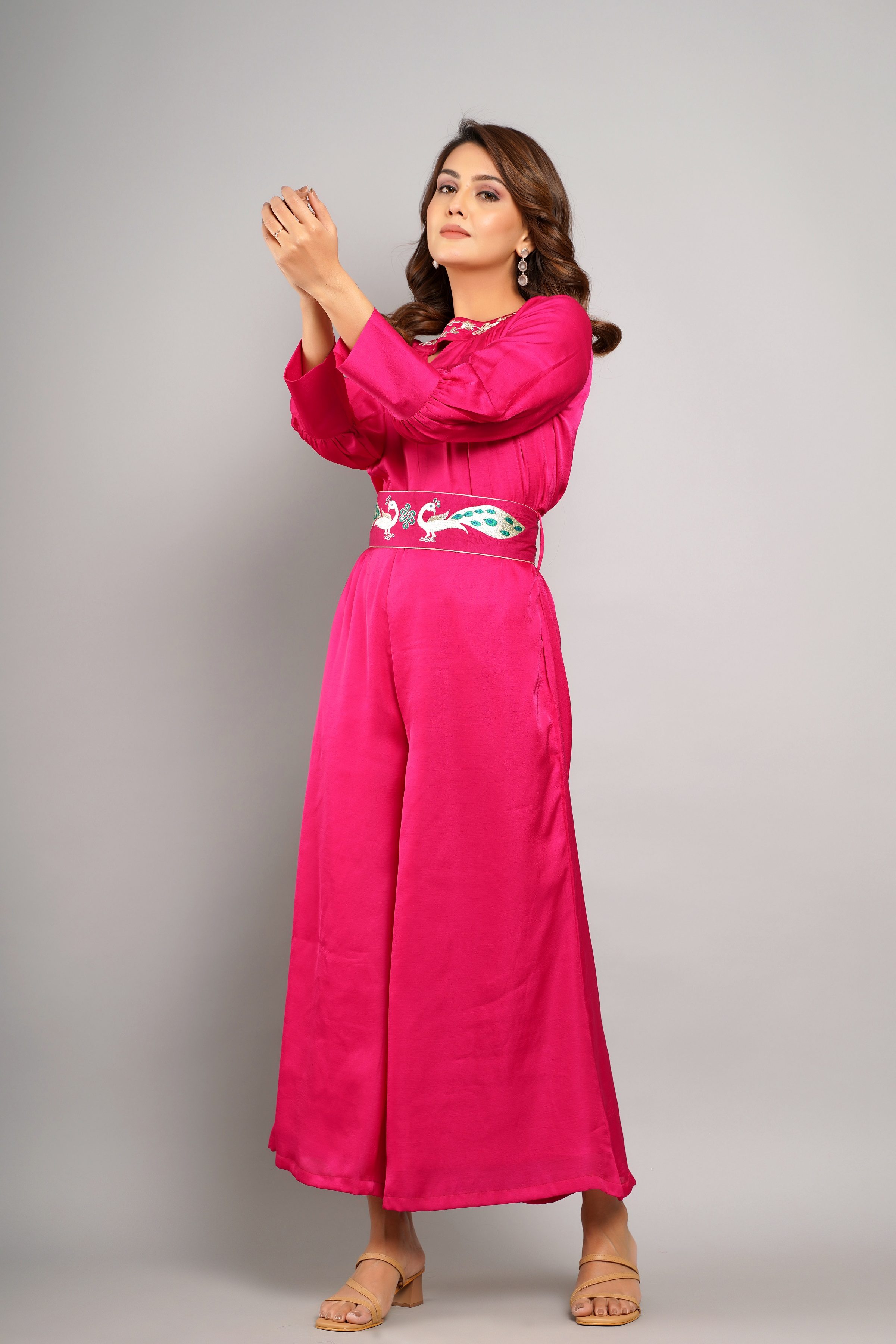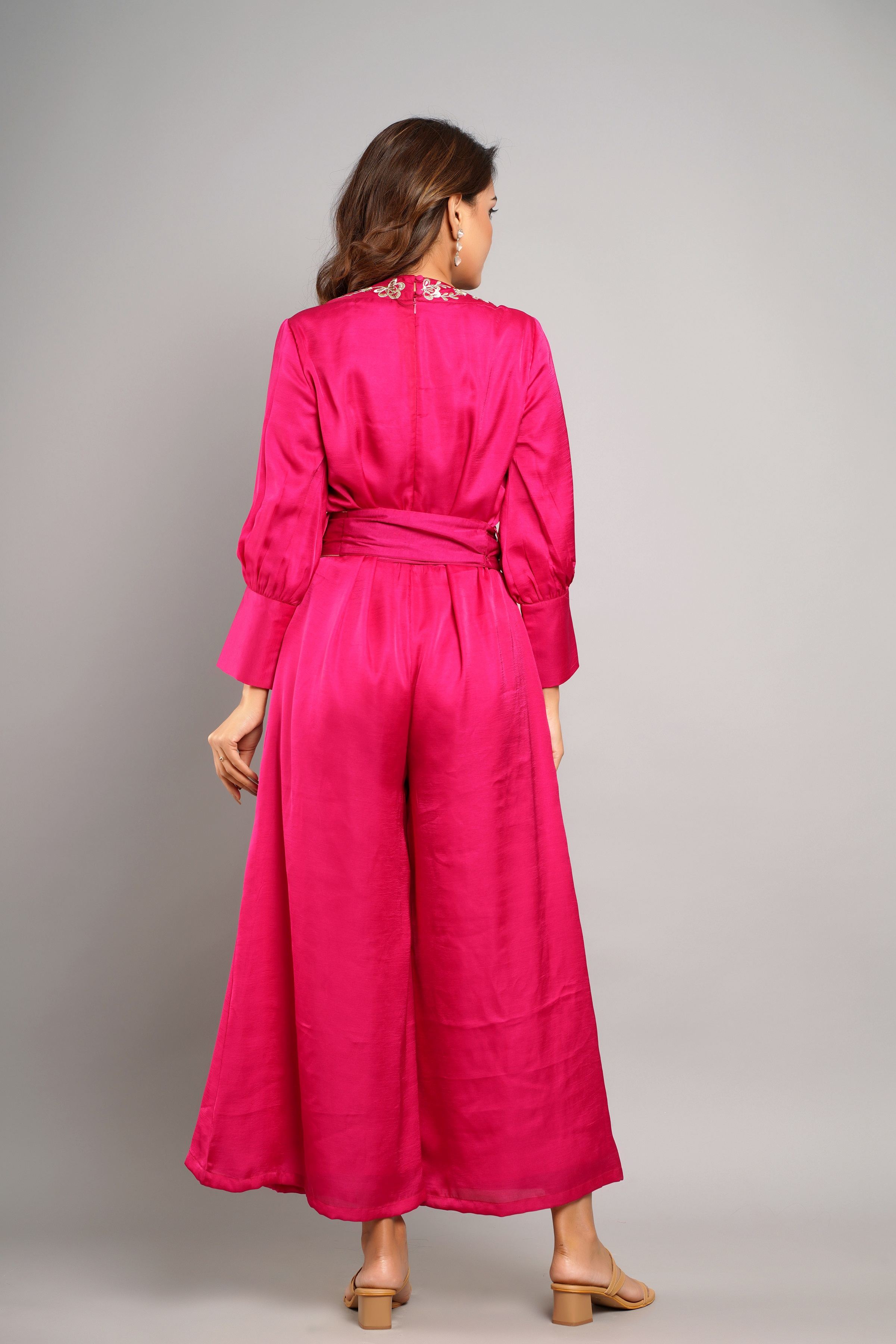 PINK EMBROIDERY WORK ON COLLAR AND EMBROIDERED BEL JUMPSUIT