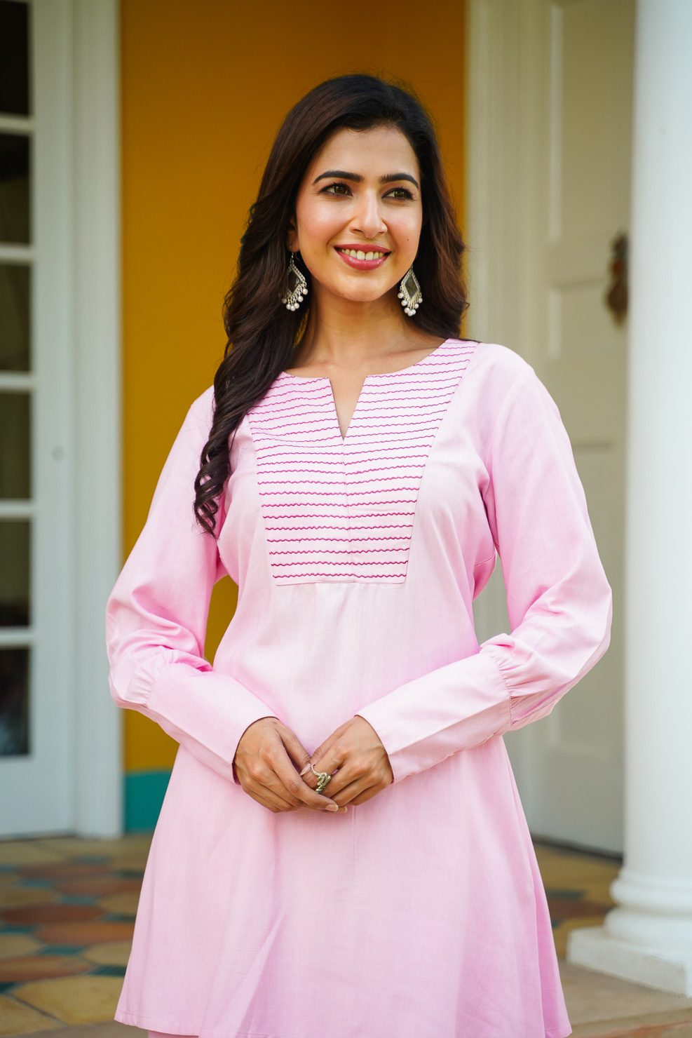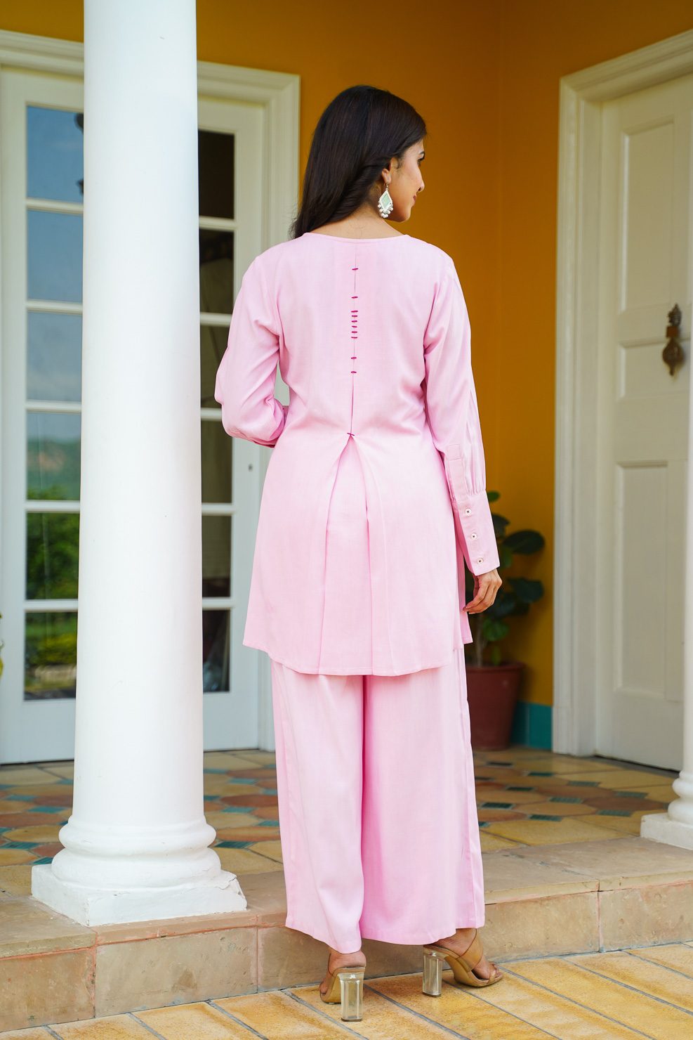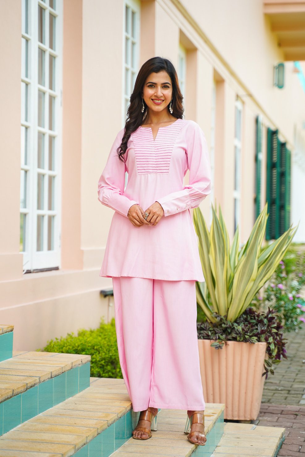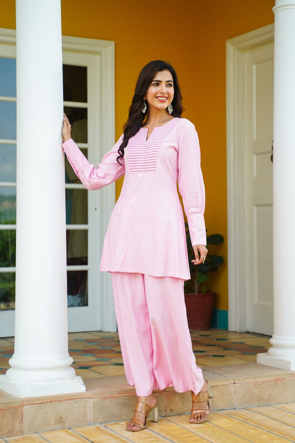 Pink rayon co-ord set with embroidered yoke and full sleeve with long cuff.