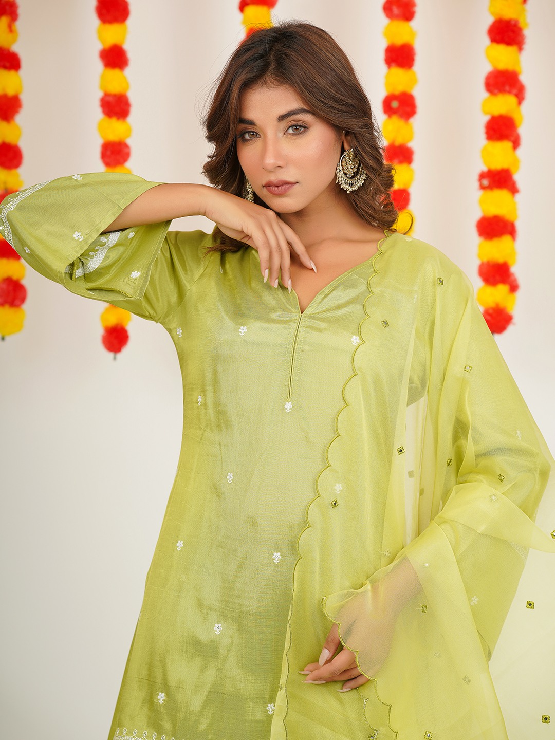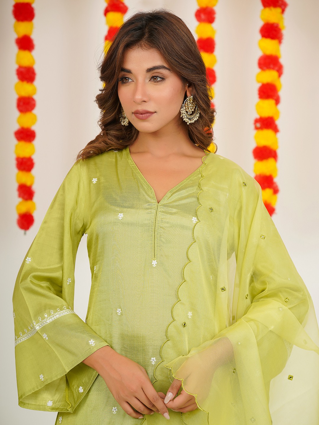 v neck embroidered green silk kurta -set