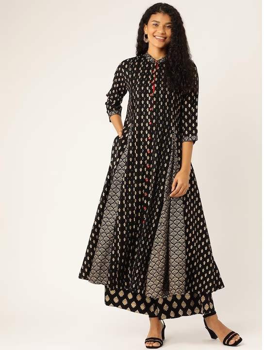 Black and golden A-line calf length kurta, has a mandarin collar, three-quarter sleeves, flared hem