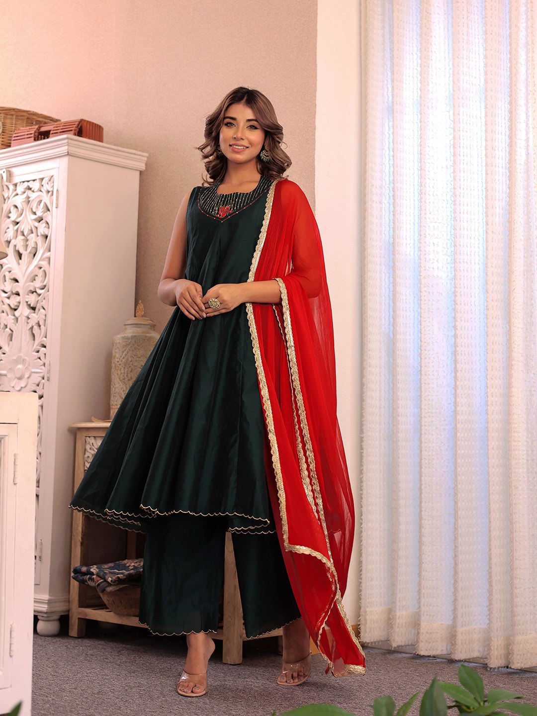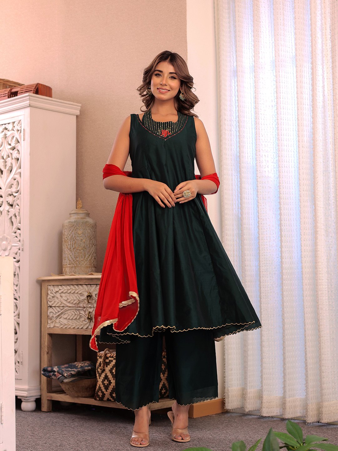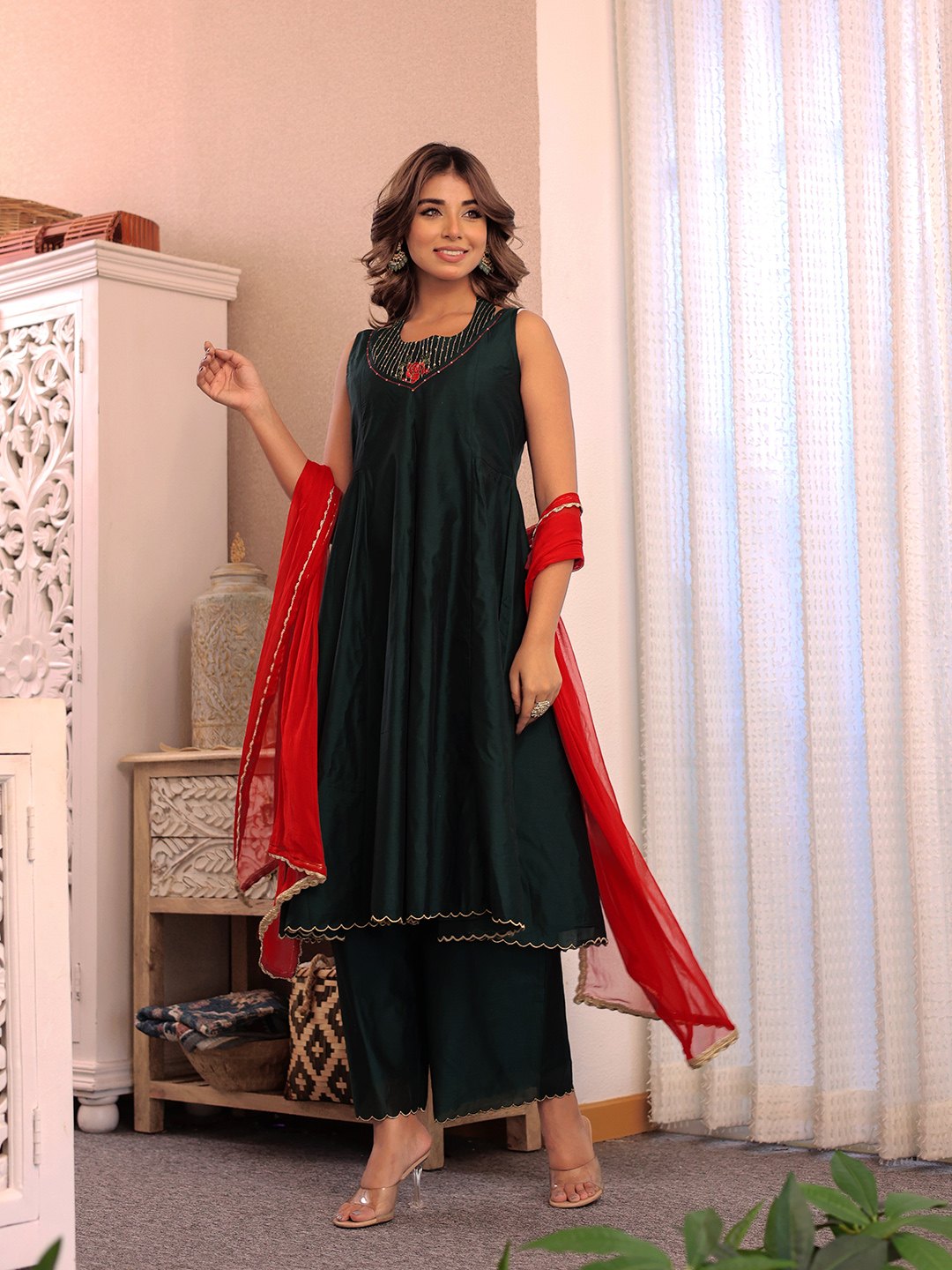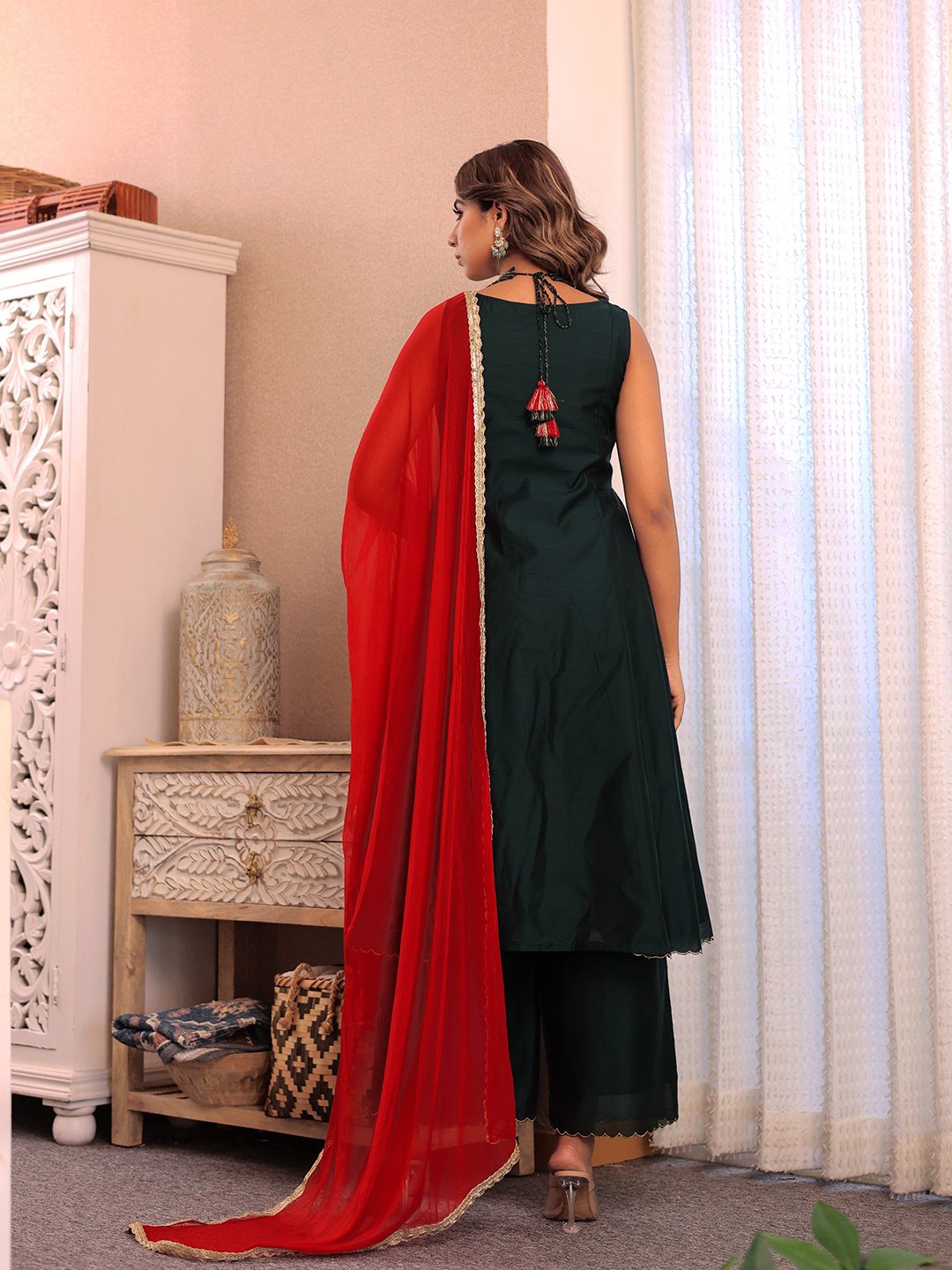WOMEN BOTTEL GREEN KURTA SET WITH RED DUPATTA