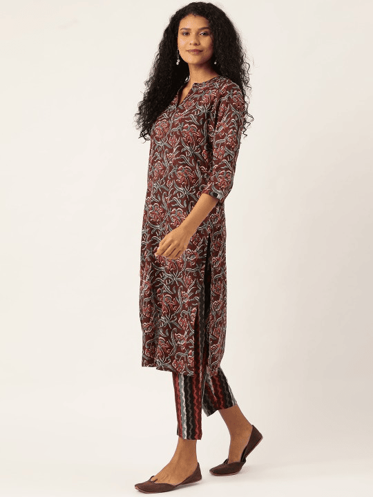 Women Coffee Brown & Blue Printed Kurta with Trousers