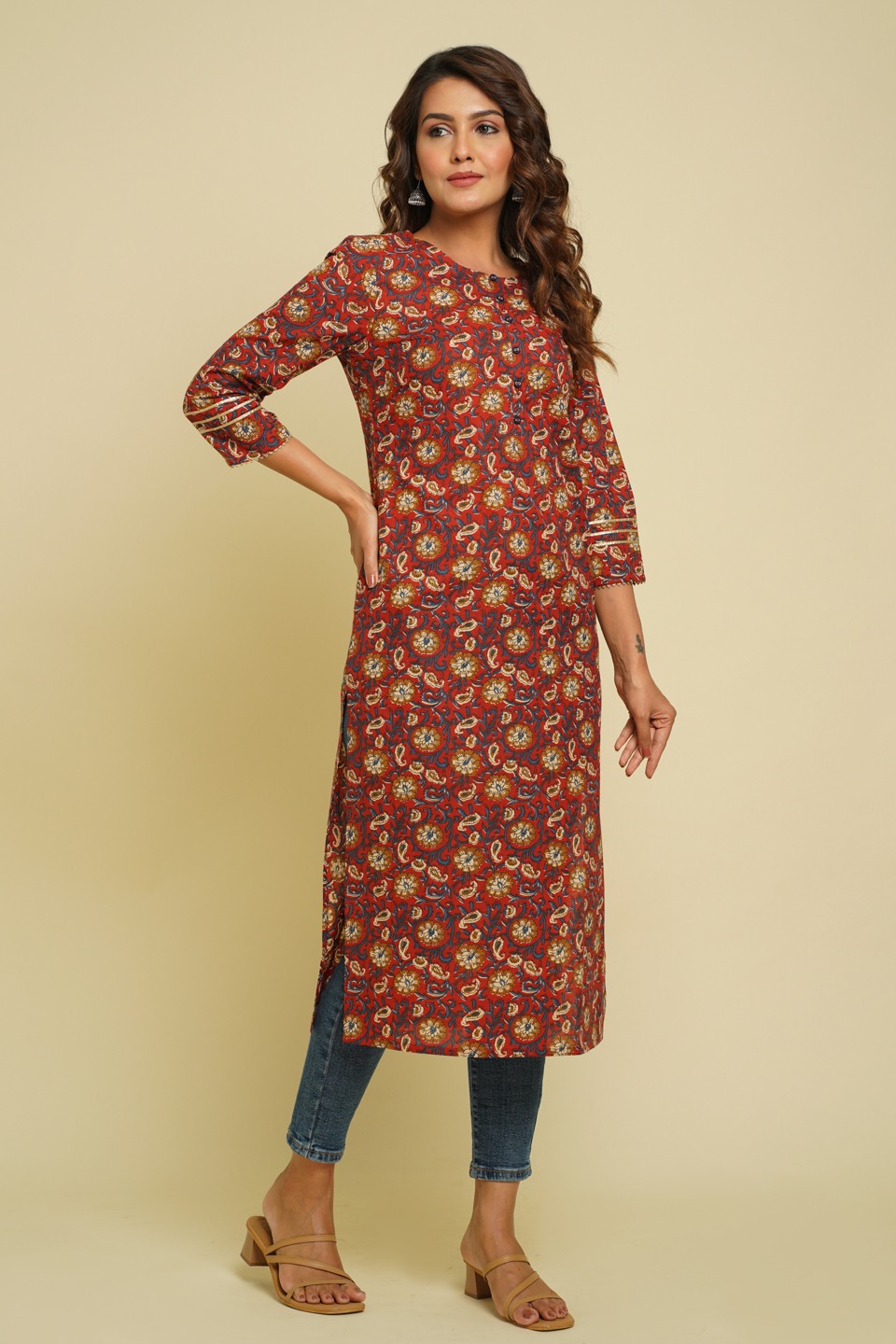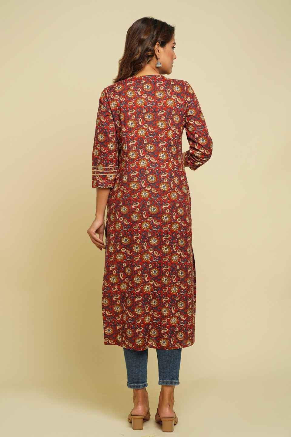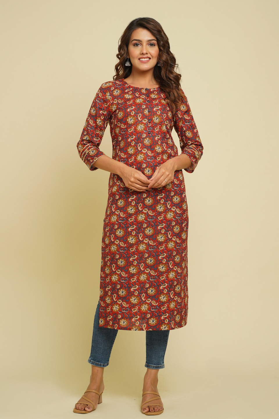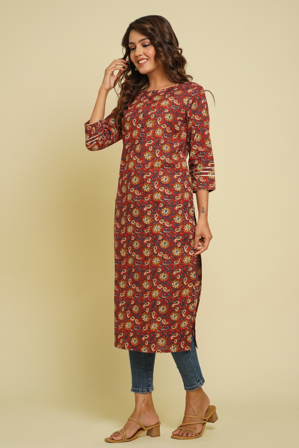 Women Red & Mustard Yellow Floral Printed Pure Cotton Kurta