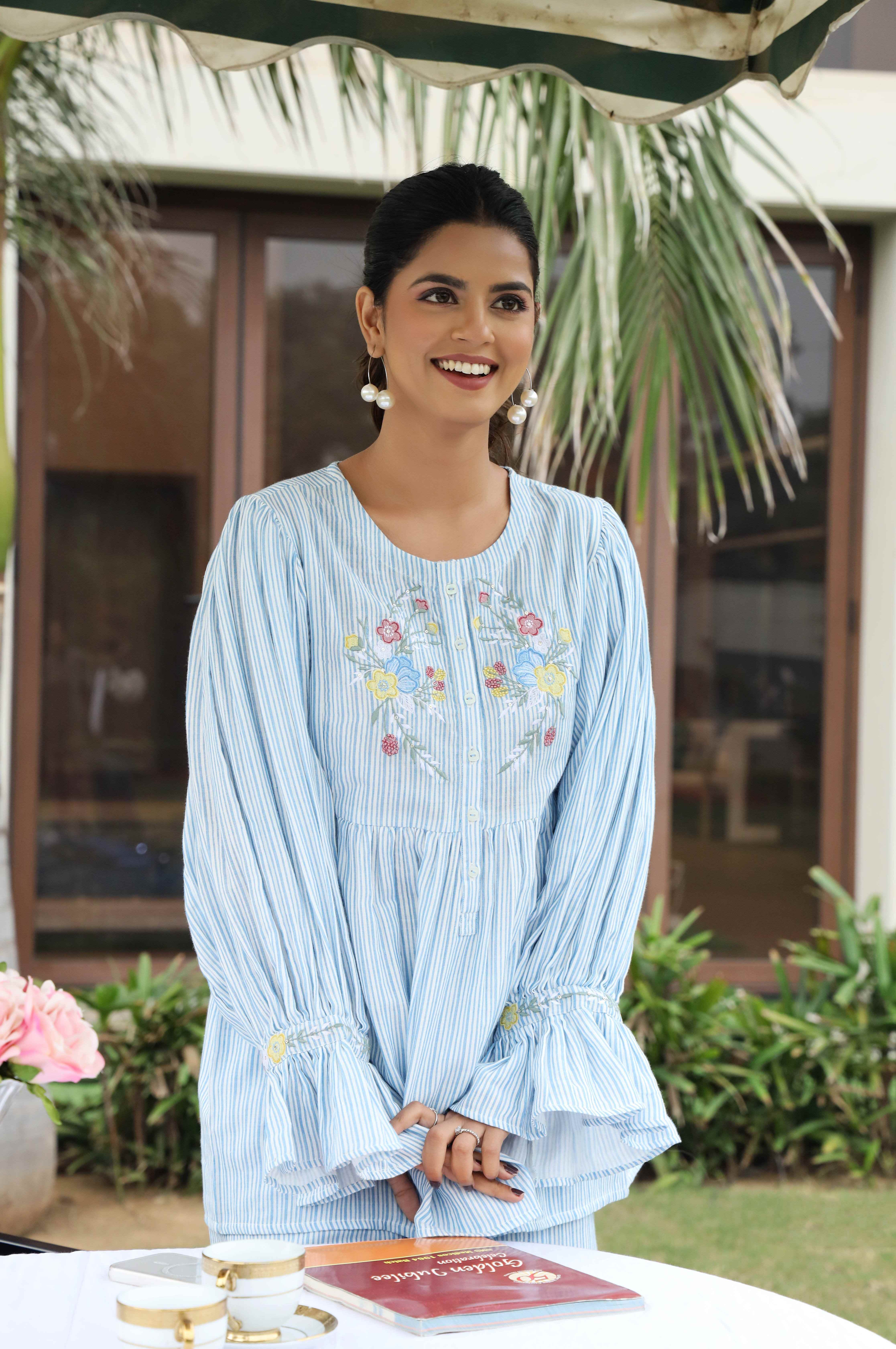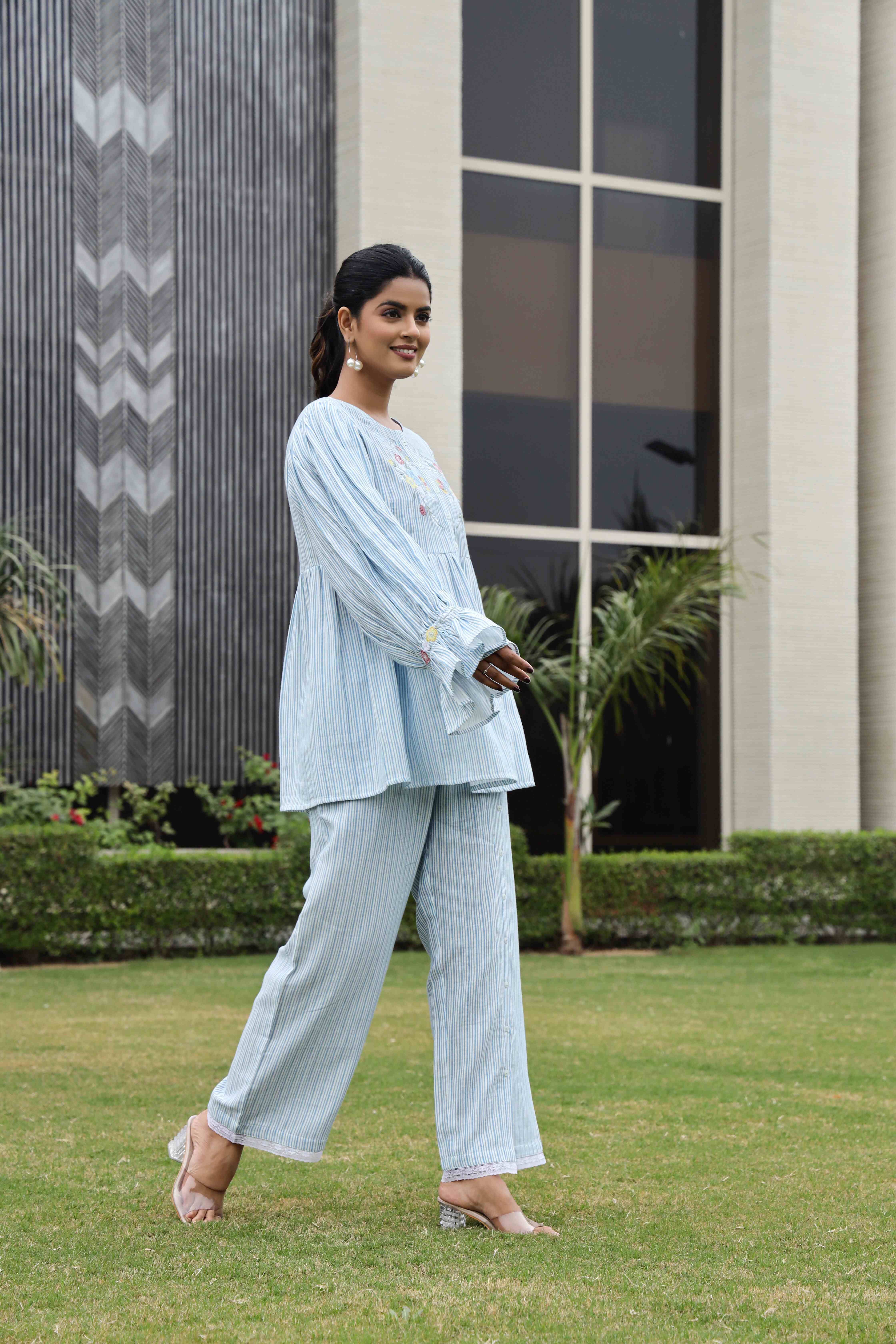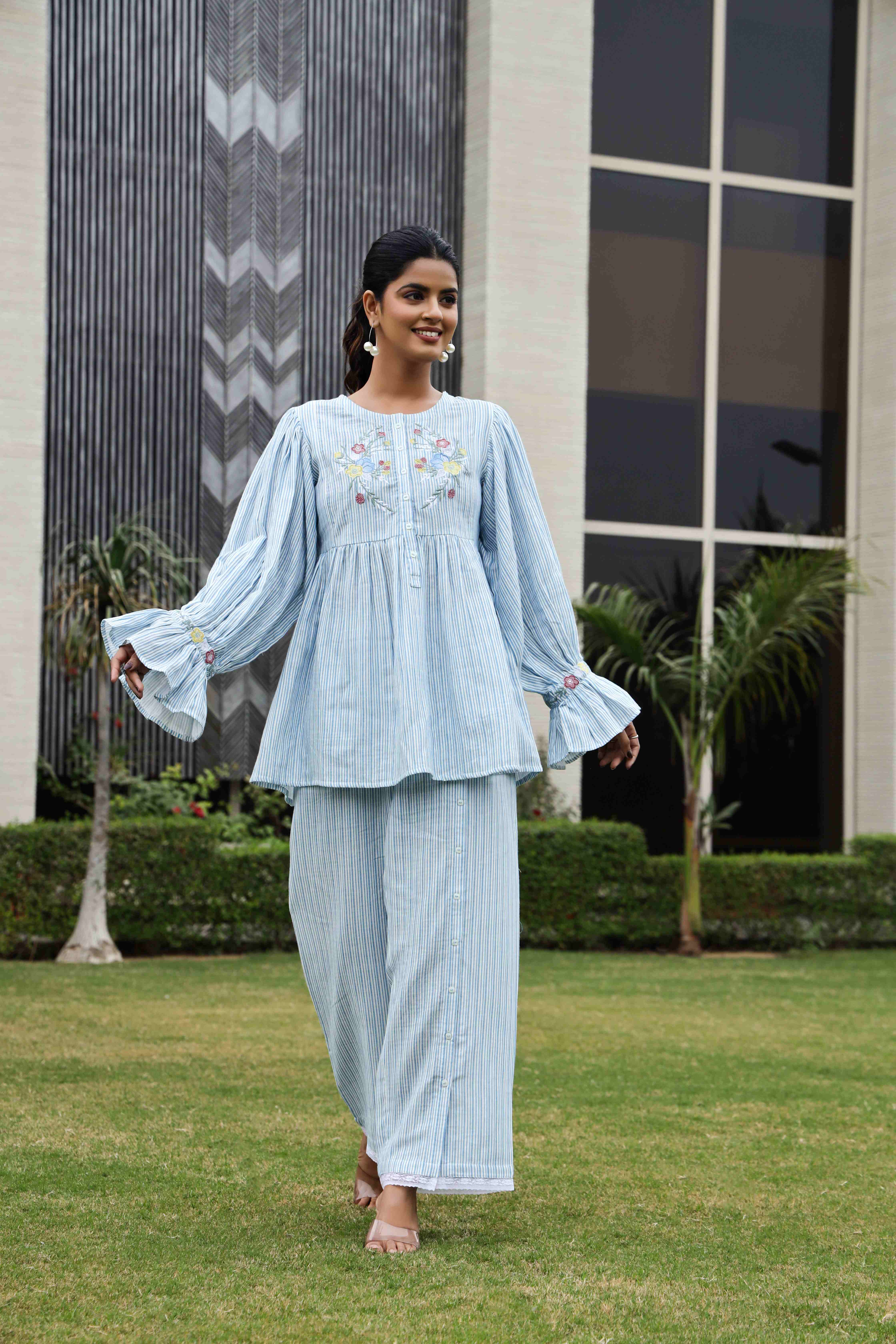 WOMEN'S EMBROIDERED WHITE & BLUE YARN DYED CO-ORD SET