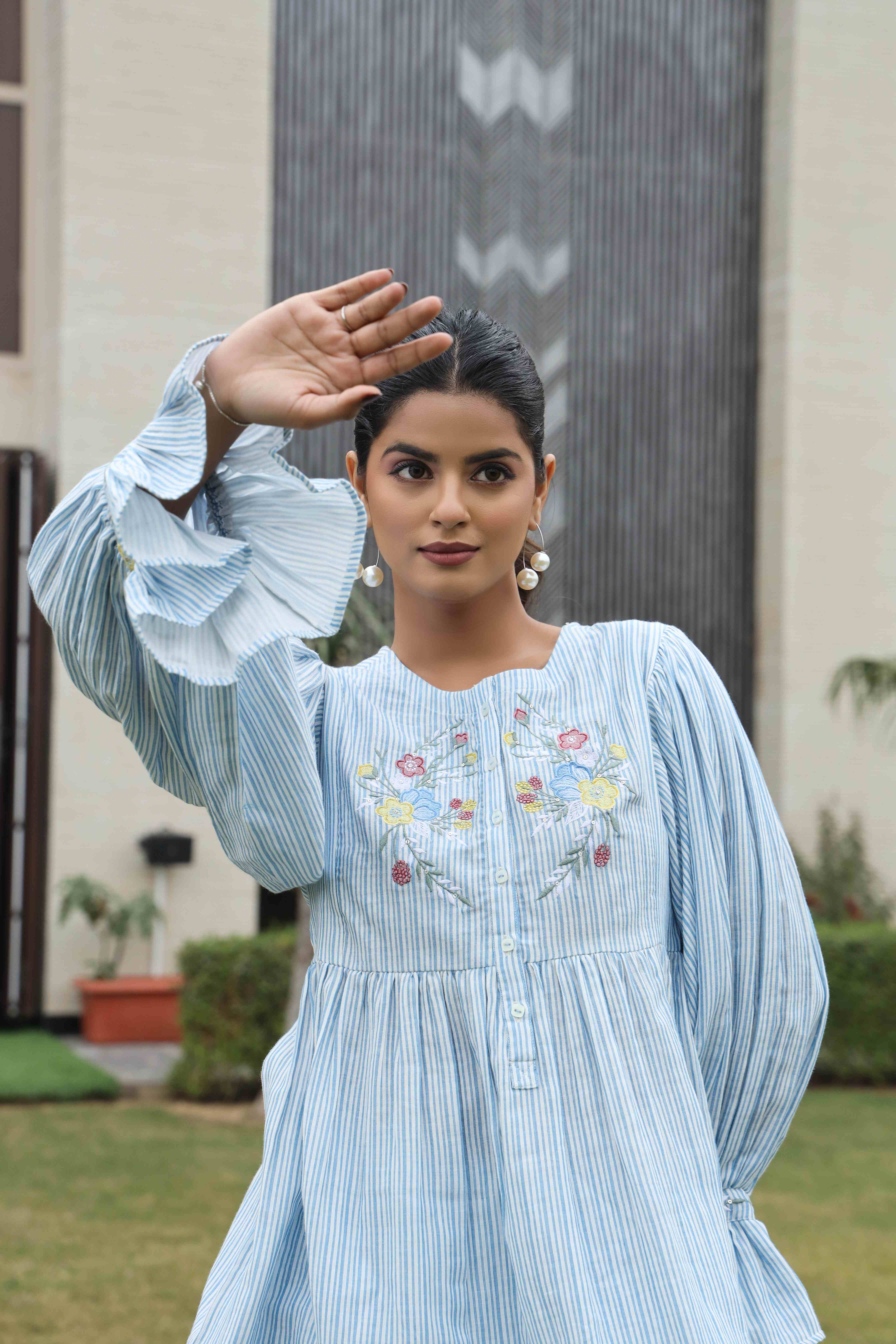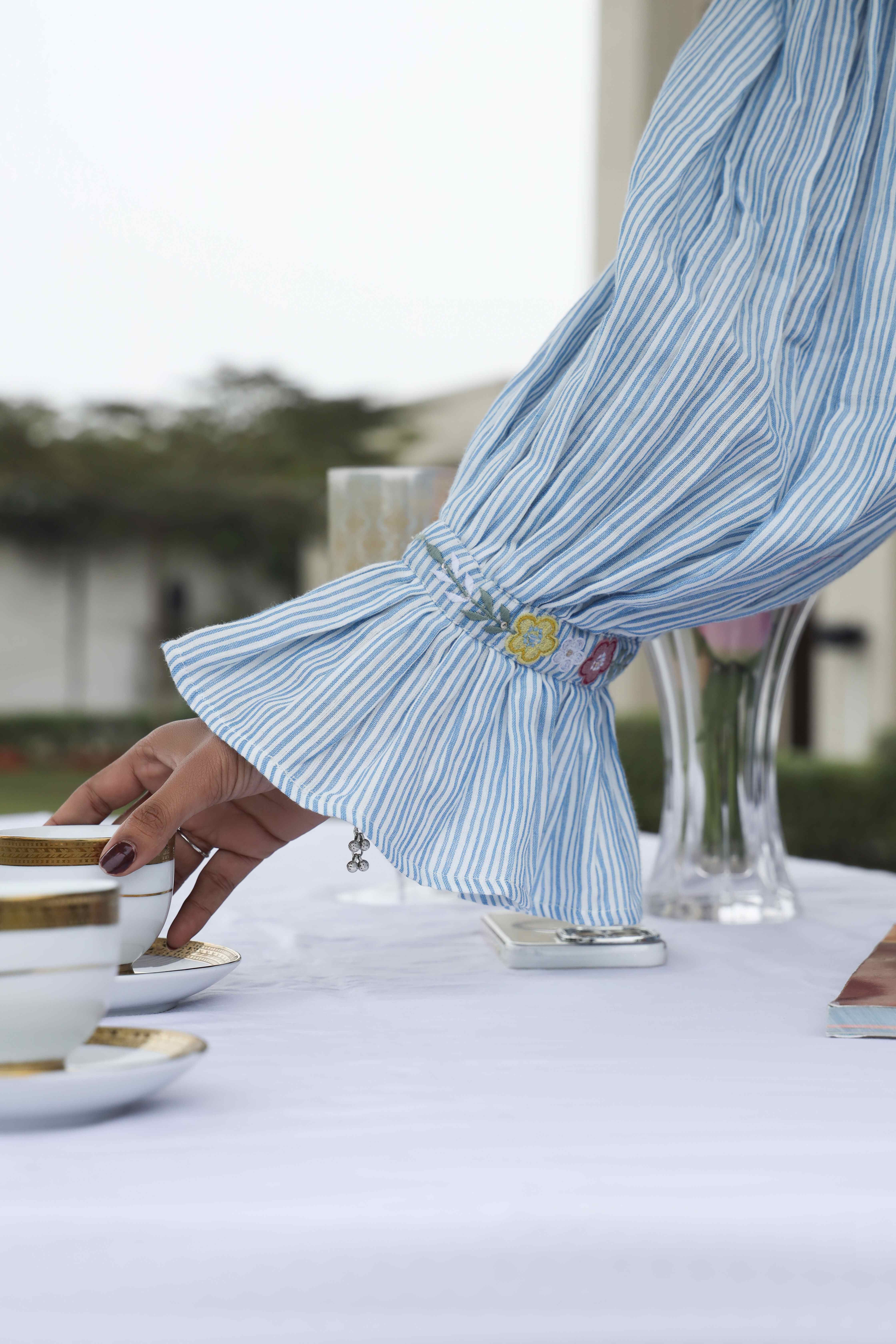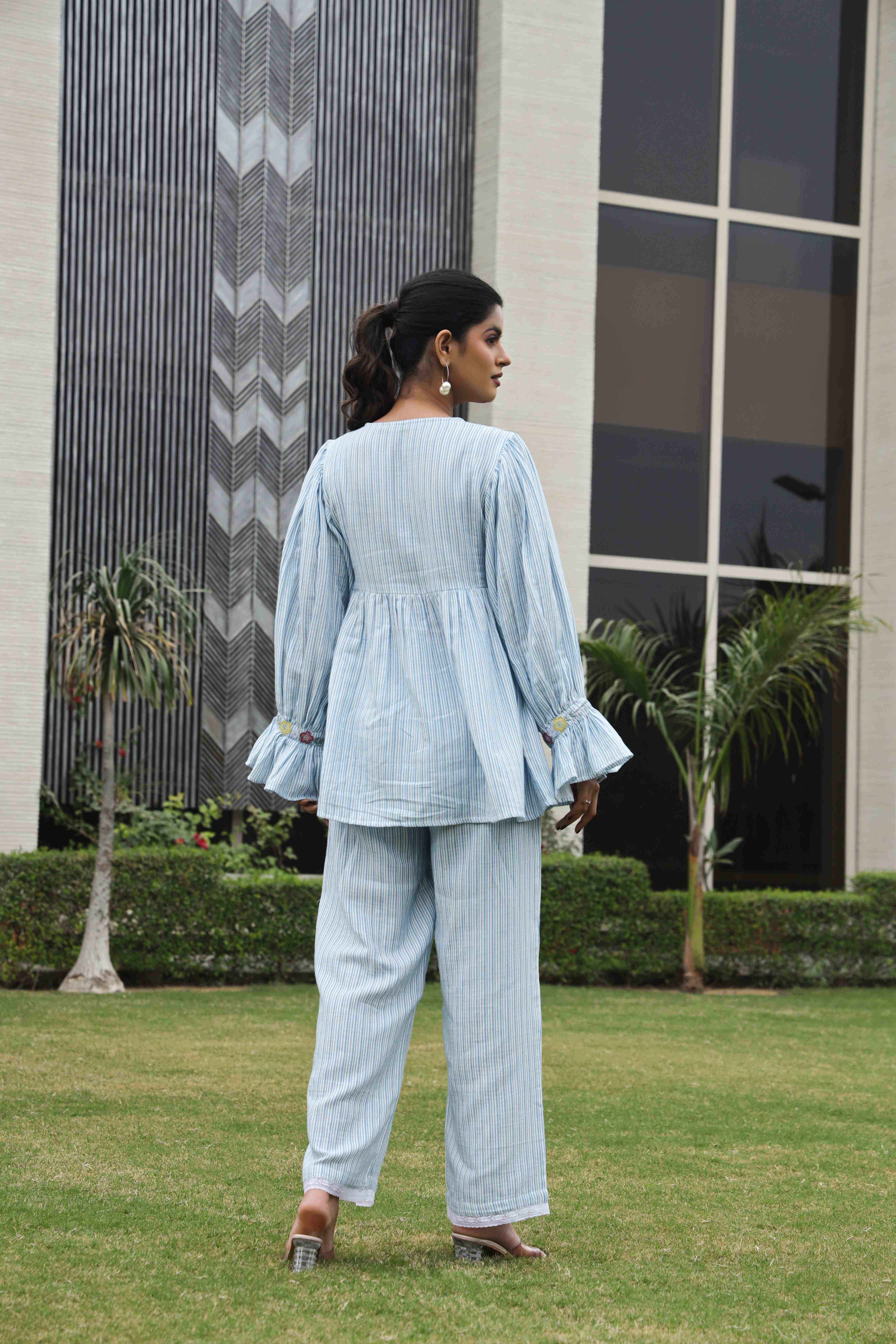 WOMEN'S EMBROIDERED WHITE & BLUE YARN DYED CO-ORD SET