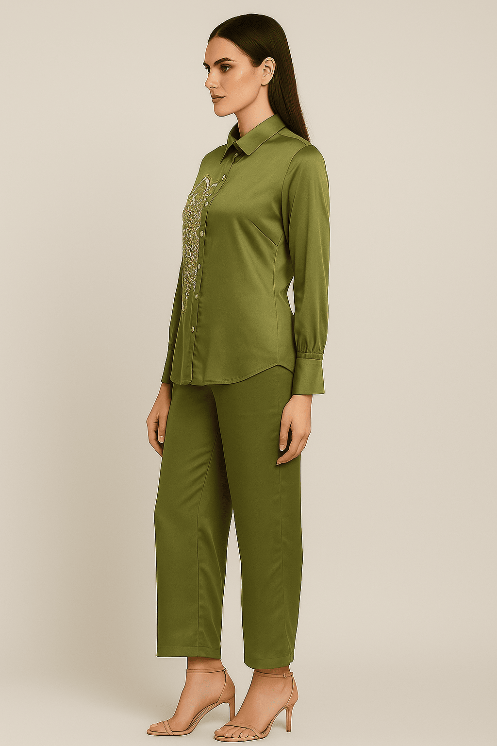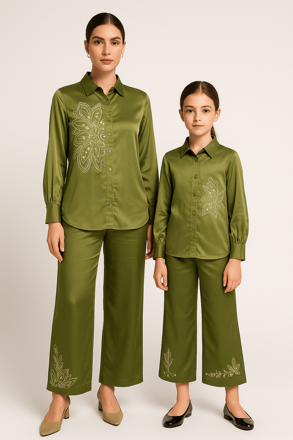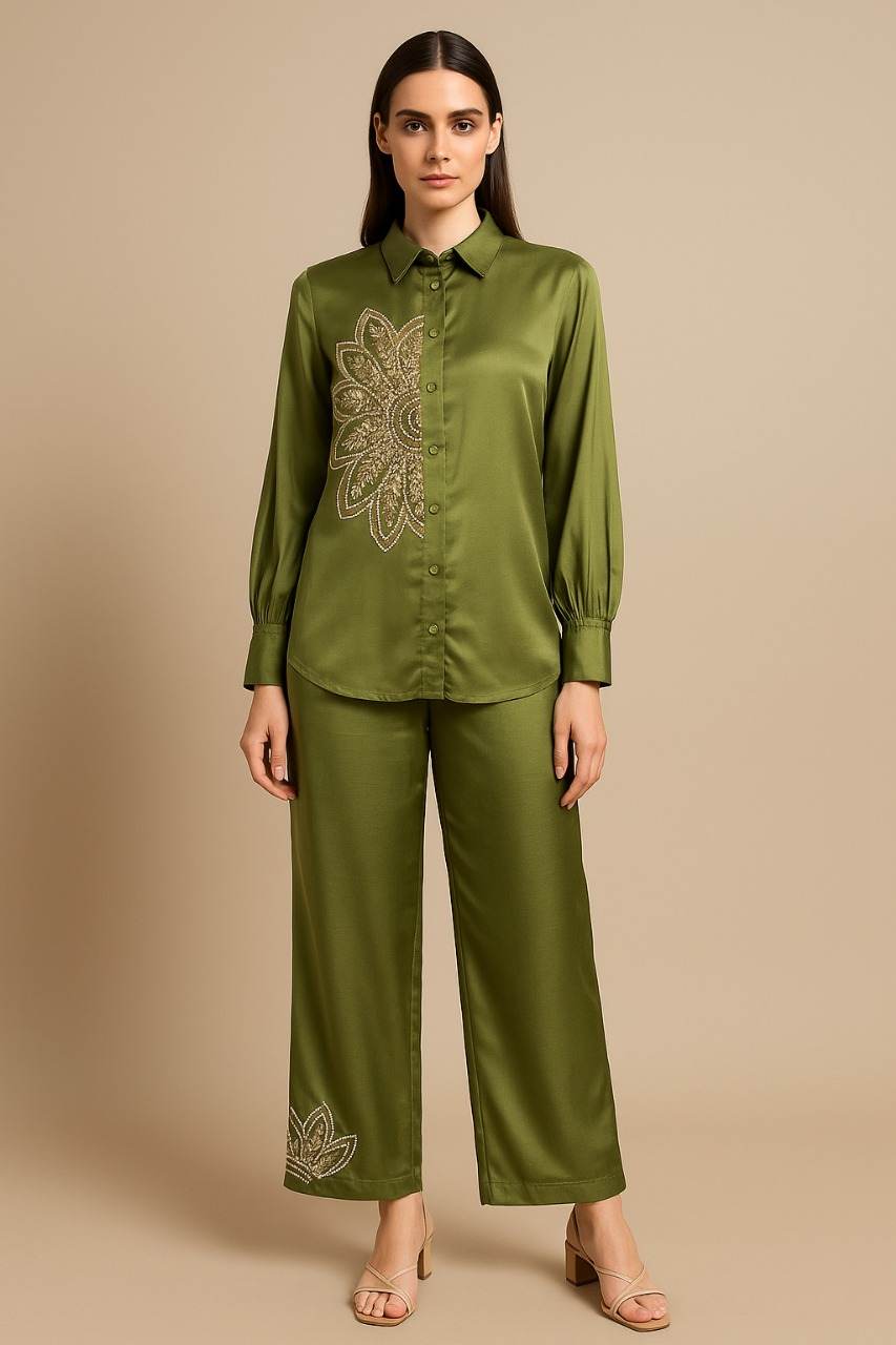 WOMEN'S GREEN BEAUTIFUL ADDA WORK MINI SILK CO-ORD SET WITH PLAZZO PANT .