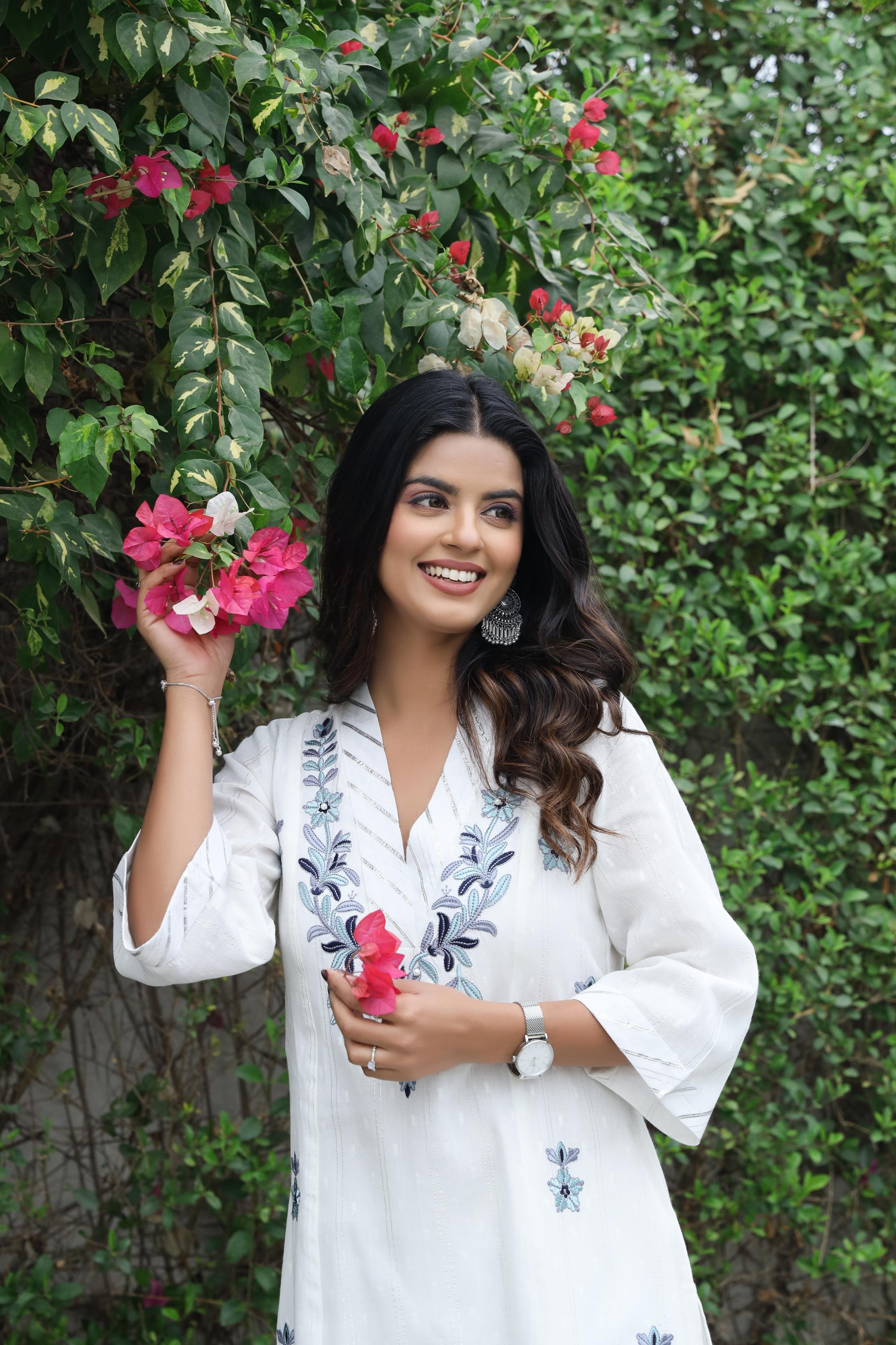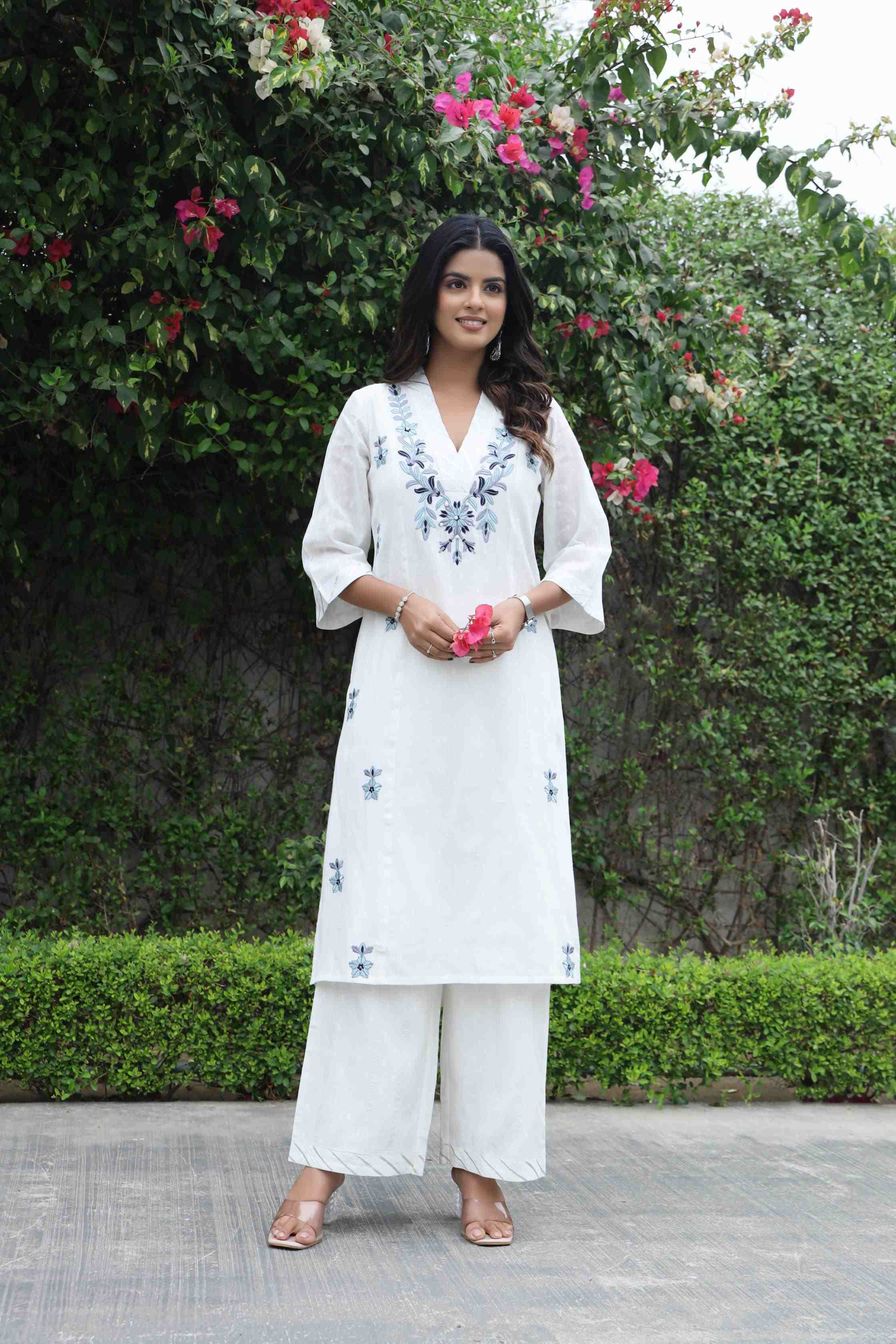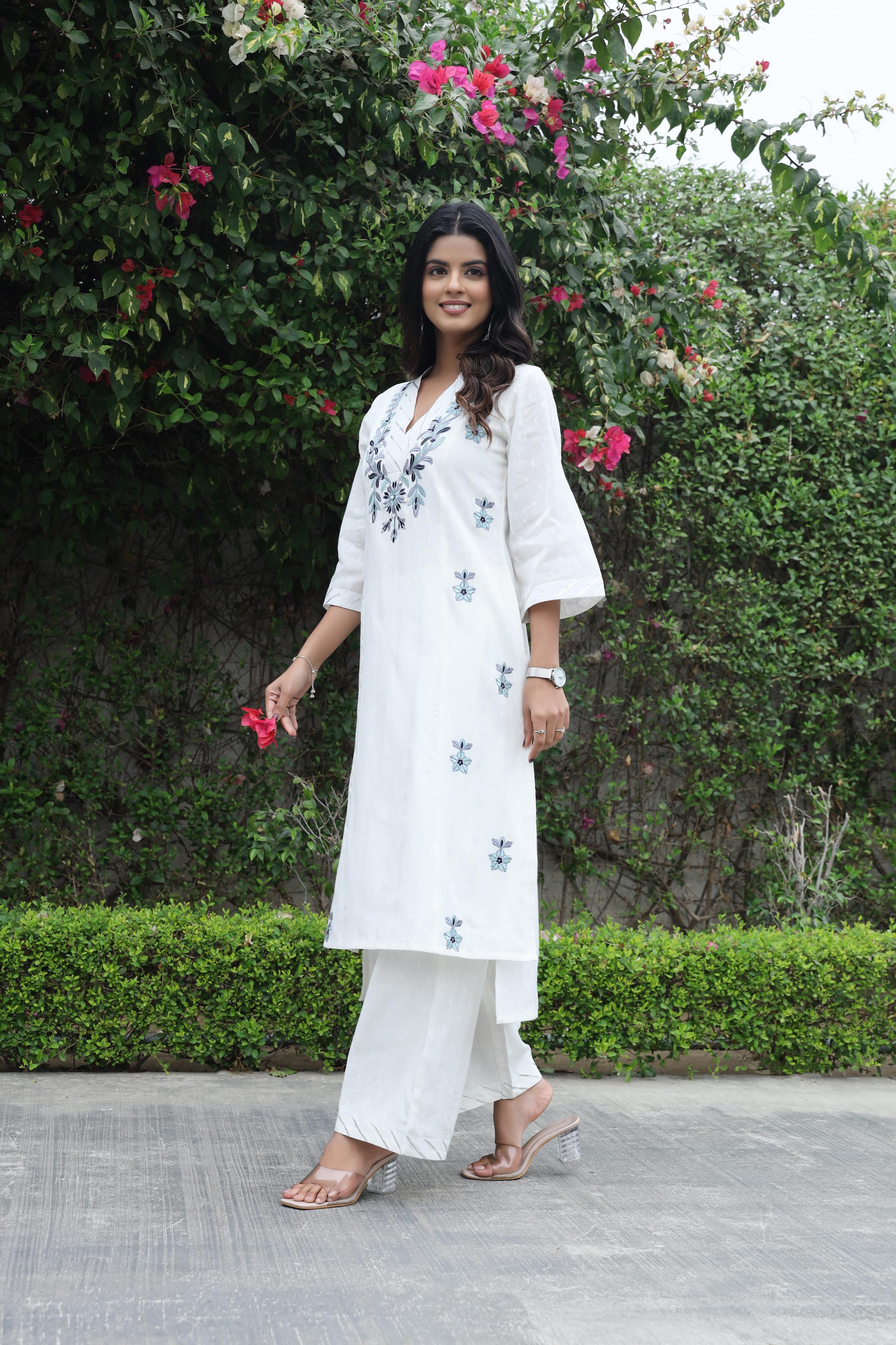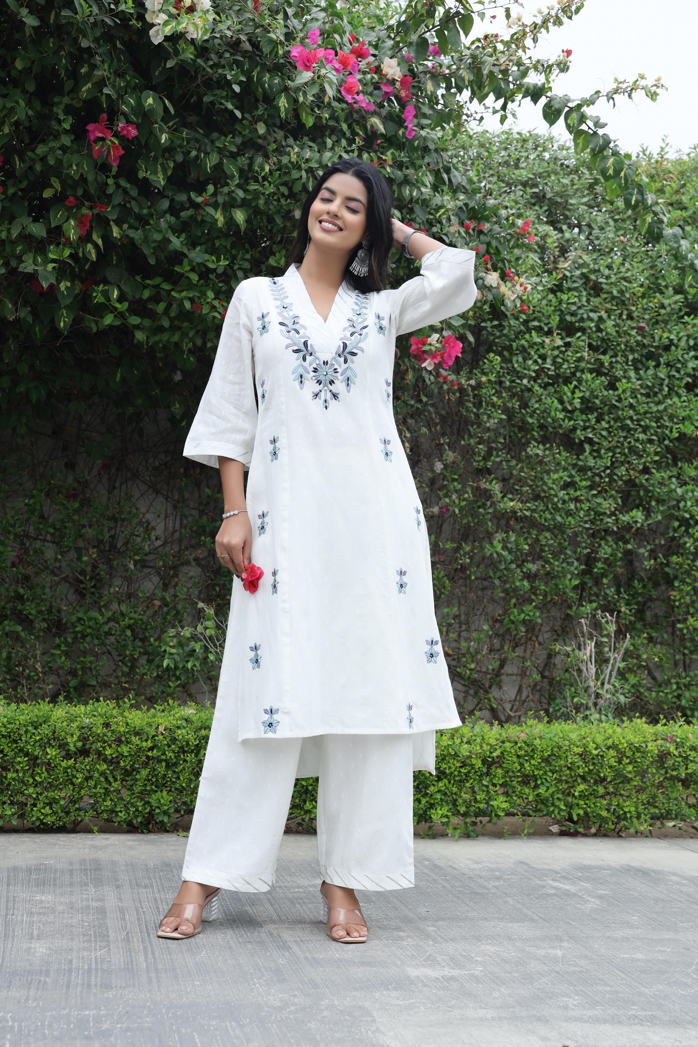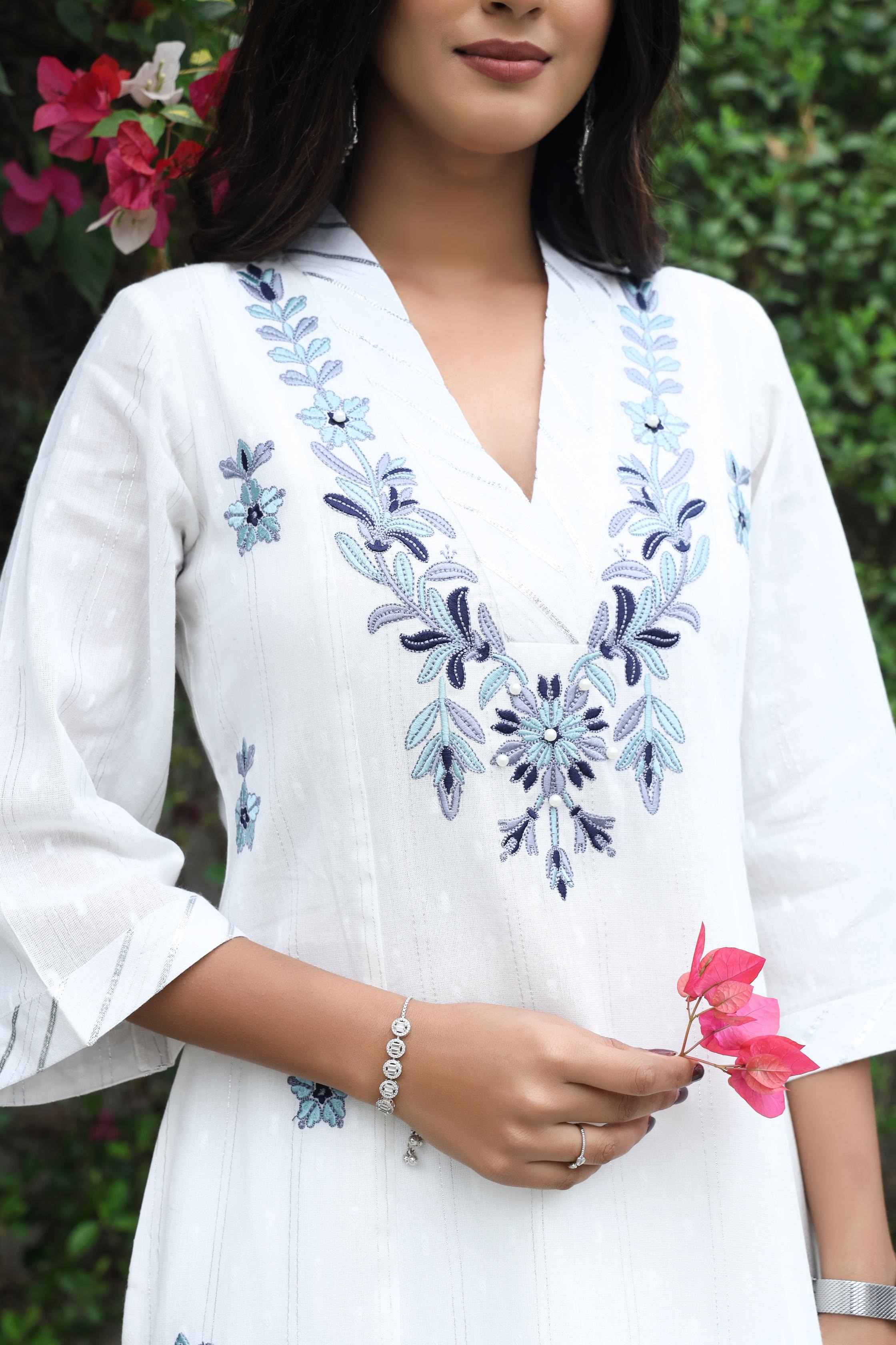 WOMEN'S WHITE LUREX EMBROIDERED KURTA SET